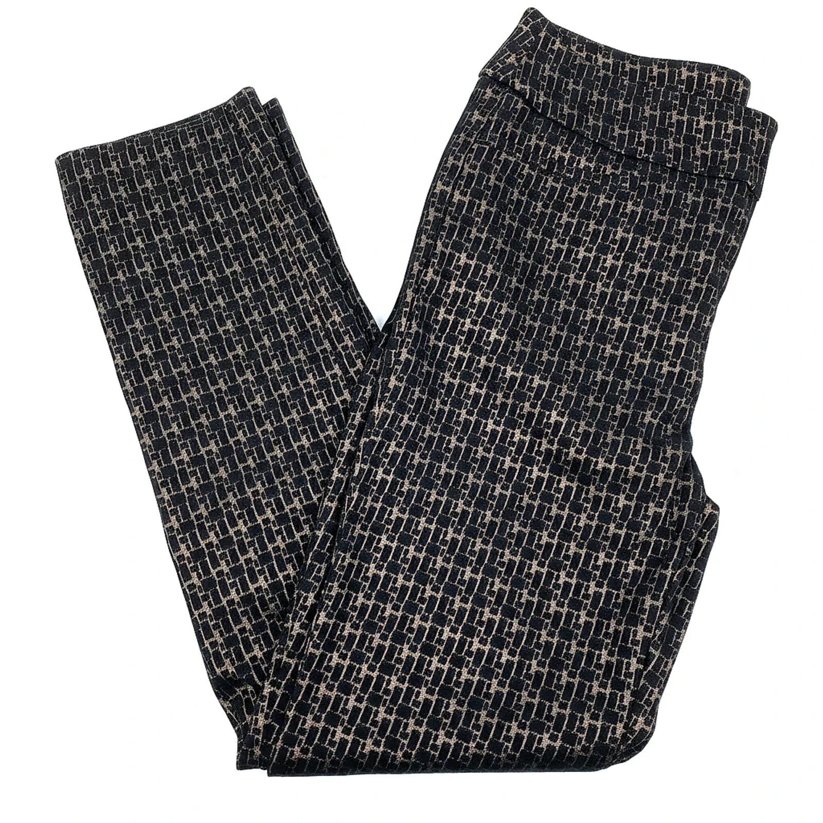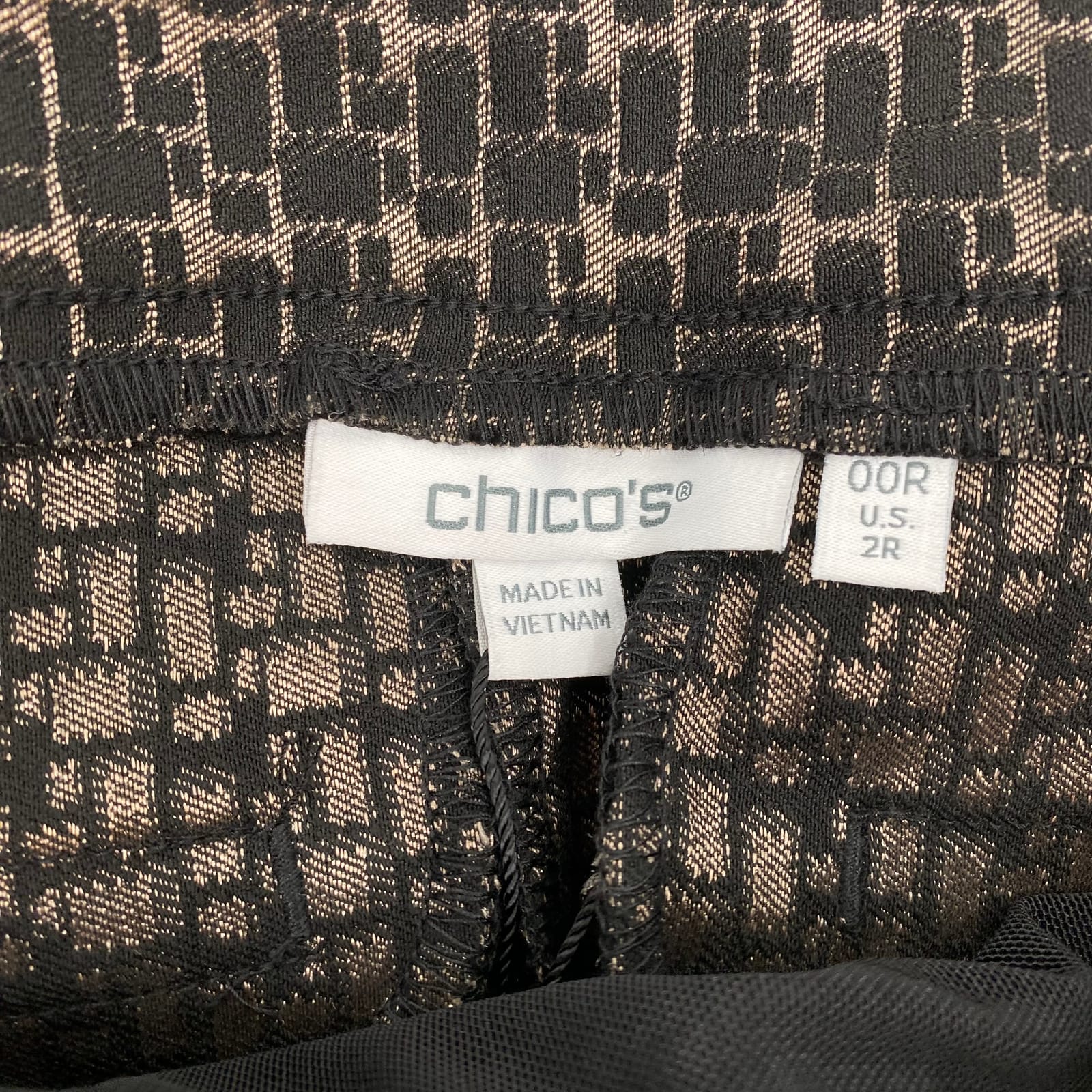 This Chico’s Brigitte Slim trousers in black with a gold print combine sleek tailoring with everyday comfort. Made from a blend of rayon, nylon, polyester and spandex, they move with you and hold their shape from desk to dinner. A timeless ankle silhouette and solid pattern make them easy to pair with a knit top or blouse—perfect for year‑round wear. Features: - Made from rayon, nylon, polyester, and spandex for stretch and drape - Ankle silhouette for modern, versatile length - Solid pattern with subtle gold print for a refined look - New with tags, in-store pickup available - Regular size 00 for a tailored fit - Approx. Measurements: Inseam Measurement: 26.5 in, Waist Measurement: 28 in, Rise Measurement: 9 in - Inventory: 1142653 A chic, go‑to pair that fits your day-to-night routine.