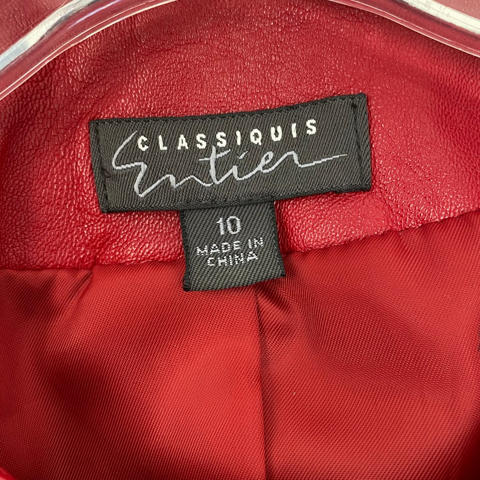 This classic red leather jacket from Classiques Entier brings instant polish to any look. Made from genuine leather with a clean, versatile silhouette, it layers effortlessly over tees, dresses, or knit sweaters. The regular size offers a comfortable fit for everyday wear across seasons, from cool spring days to crisp fall evenings. A timeless staple that adds a bold, polished edge to your wardrobe. Features: - Genuine leather for durability and a premium feel - Classic, versatile jacket silhouette - Regular size (Women’s US 10) for a reliable fit - Red leather adds a bold, timeless touch - Made in China with everyday wear in mind - Approx. Measurements: Pit To Pit: 19, Length: 25 - Inventory: 1143365 A bold staple that won’t wait around for long.