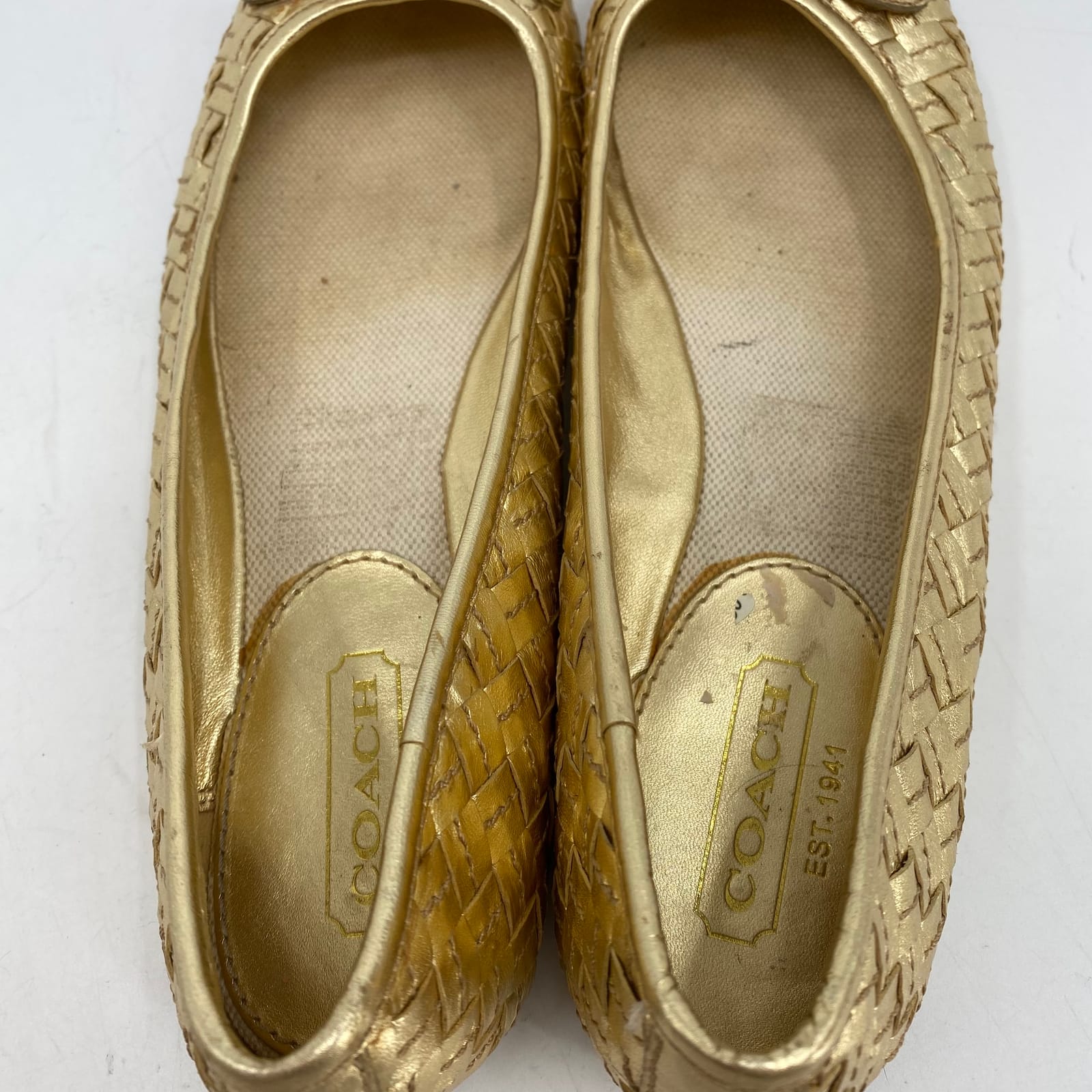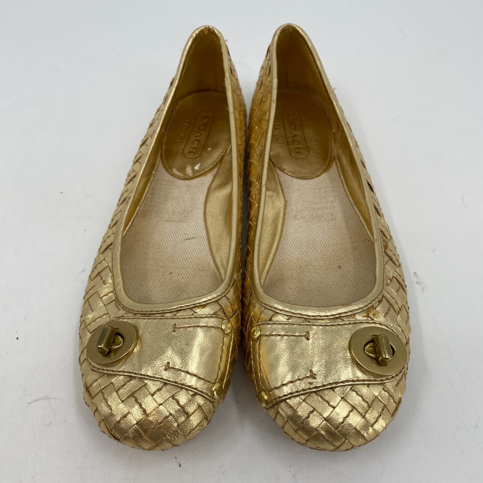 Step into style with the Coach Gold Woven Flats, where comfort meets chic! These elegant flats are perfect for any occasion, whether you're heading to the office or enjoying a casual day out. Picture yourself gliding effortlessly in these classic loafers, made with high-quality leather that hugs your feet with every step. The round toe design and woven pattern add a touch of sophistication to your wardrobe, making these flats a must-have for every woman’s shoe collection. Slip into luxury today with these versatile shoes that transition beautifully across all seasons! Features: - Crafted from high-quality leather for durability and comfort - Elegant woven design for a sophisticated touch - Round toe shape for a classic and flattering fit - Versatile style suitable for any occasion - Perfect for year-round wear: Winter, Spring, Summer, Fall - Flaws: Wear on footbeds, as pictured. - Inventory: 1099212 Don't miss out on adding these stunning Coach Gold Woven Flats to your collection. Treat your feet to the comfort they deserve and step out in style—order now!