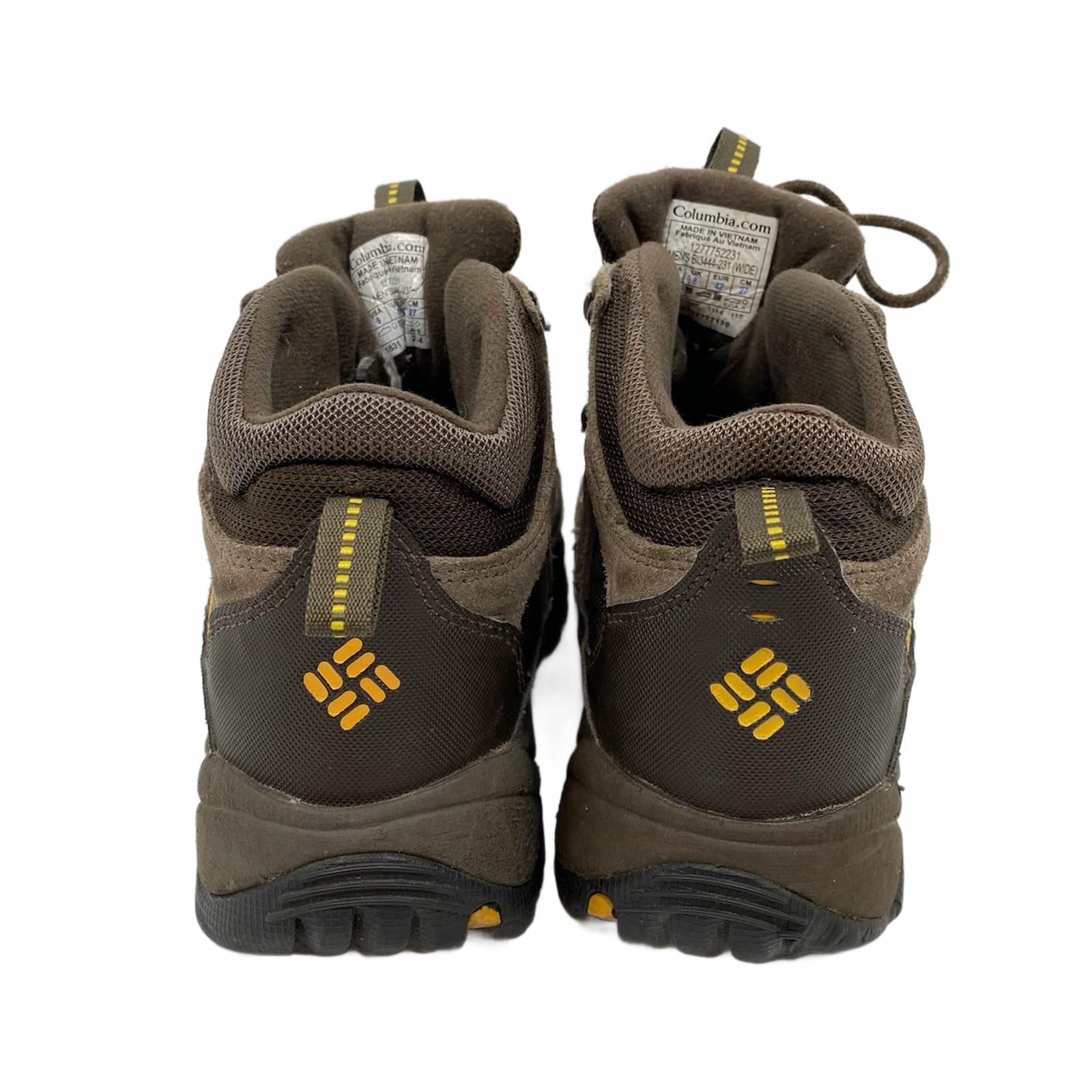 These Columbia waterproof hiking boots are built for outdoor days in any weather. The brown desert-style boots pair with rugged outfits and keep your feet dry with reliable waterproof construction. Made in Vietnam with a rubber upper and suede accents, they offer durability and grip for trail or city paths. Size 9 regular fits most men’s feet, ready to handle fall and winter hikes or spring strolls. Features: - Waterproof design for all-weather use - Rubber upper for durability and grip - Suede accents add rugged style - All-season use for outdoor activities - Made in Vietnam for solid build - Flaws: Stains on the suede front and side parts of the shoe, as seen in the photos - Inventory: 1135886 A rugged, dependable choice that won’t back down when the trail calls.