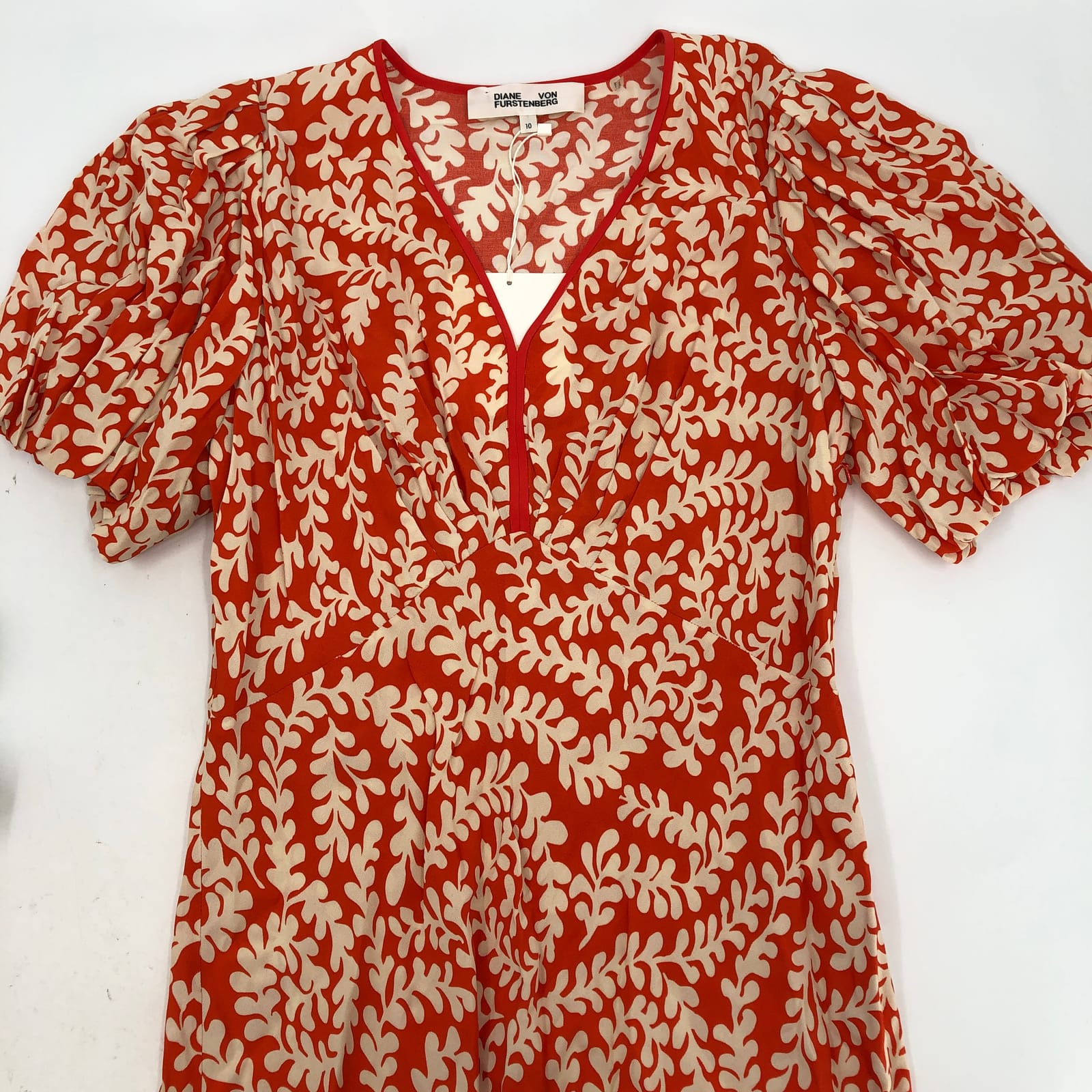Step into a world of sophistication with the Diane Von Furstenberg Orange Cream Madrid Patterned Ruffle Hem Midi Dress. This enchanting midi dress, featuring a stylish V-neck and charming puff sleeves, is perfect for any occasion—be it a sunny summer brunch or a cozy fall gathering. Picture yourself twirling in this stunning piece, with its vibrant orange and cream hues stealing the spotlight. Whether you call it a ruffle hem dress or a chic midi frock, this timeless classic will elevate your wardrobe effortlessly! Features: - Elegant V-neckline for a flattering fit - Charming puff sleeves add a touch of whimsy - Stylish ruffle hem for a playful flair - Zip closure for easy wear - Versatile for Spring, Summer, and Fall occasions - Approx. Measurements: Pit To Pit: 18.5 in, Length: 43 in - Inventory: 1102843 Don’t miss out on the chance to own this eye-catching midi dress. Add it to your cart today and embrace your new favorite wardrobe staple!