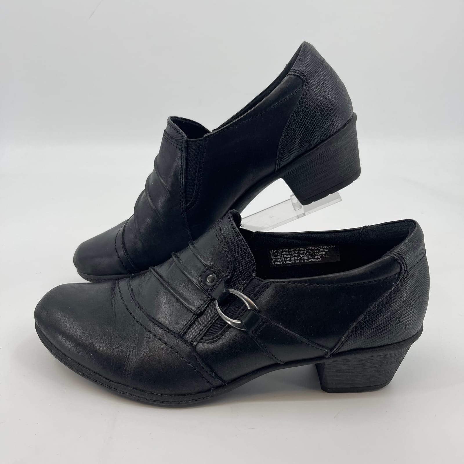 Step out in timeless elegance with these Earth Origins Black Leather Mules & Clogs. Perfect for any occasion, these versatile shoes are your new go-to for both comfort and style. The slight wear around the toe area adds a vintage charm, making each pair uniquely yours. Whether you're heading to the office or out for a casual stroll, these shoes will make every step feel like a walk in the park. Just pull them on and you're ready to go! Features: - Versatile round toe shape - Comfortable low block heel (1-1.9 in) - Classic pull on closure - Suitable for all seasons - Made in China with leather and synthetic materials - Flaws: Slight wear around toe area of shoes - Inventory: S059 5000-1314 Don't miss out on the perfect blend of comfort and style! These Earth Origins Black Leather Mules & Clogs are just a click away from becoming your new favorite pair. Order now and put your best foot forward!