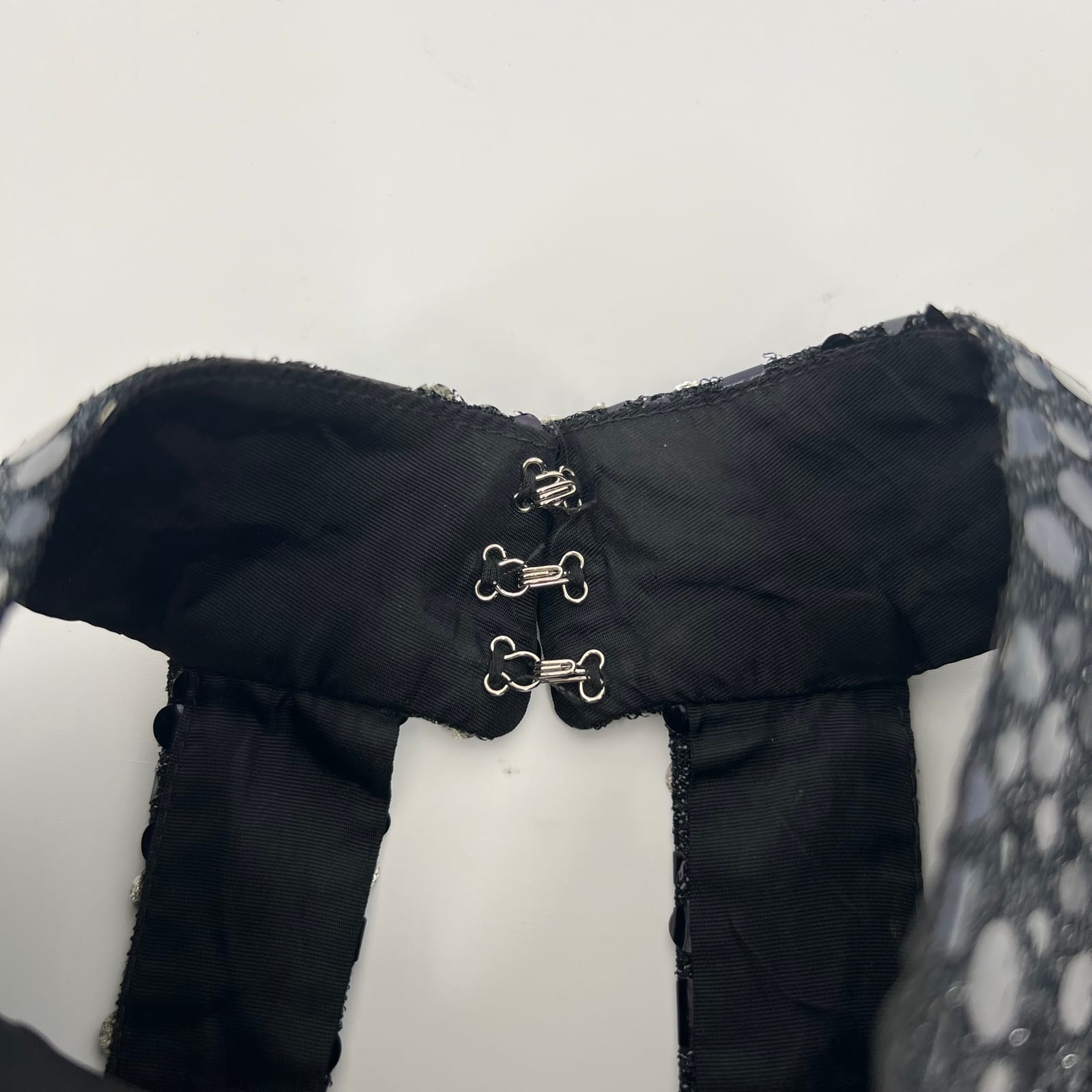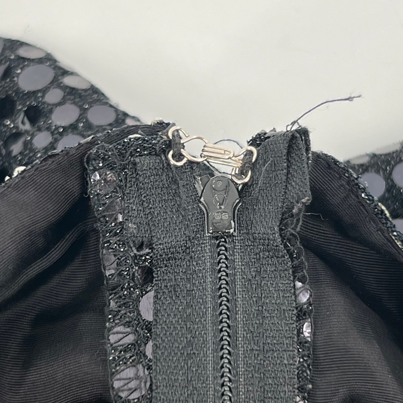 Step into timeless elegance with this Flirtations Black Vintage Sequin Maxi Dress. This enchanting black maxi dress will have you sparkling at every event, with its shimmering sequins adding a magical touch to your look. Whether you call it a long evening gown or a sleeveless black dress, this beauty is your ticket to standing out in any crowd. The high-neck design perfectly combines glamour and sophistication, making it ideal for any occasion—from winter galas to spring soirées. Features: - Vintage-inspired sequin embellishments - Elegant high neck with zip closure - Versatile for any season or occasion - Classic solid pattern with a sleeveless design - Crafted from durable nylon and acetate blend - Approx. Measurements: Length: 56 in - Flaws: Some sequins beginning to peel on back, but not very noticeable, as pictured. No size tag. - Inventory: 1074901 Don't let this one-of-a-kind vintage sequin maxi dress slip away—add this timeless piece to your wardrobe and dazzle at your next event!