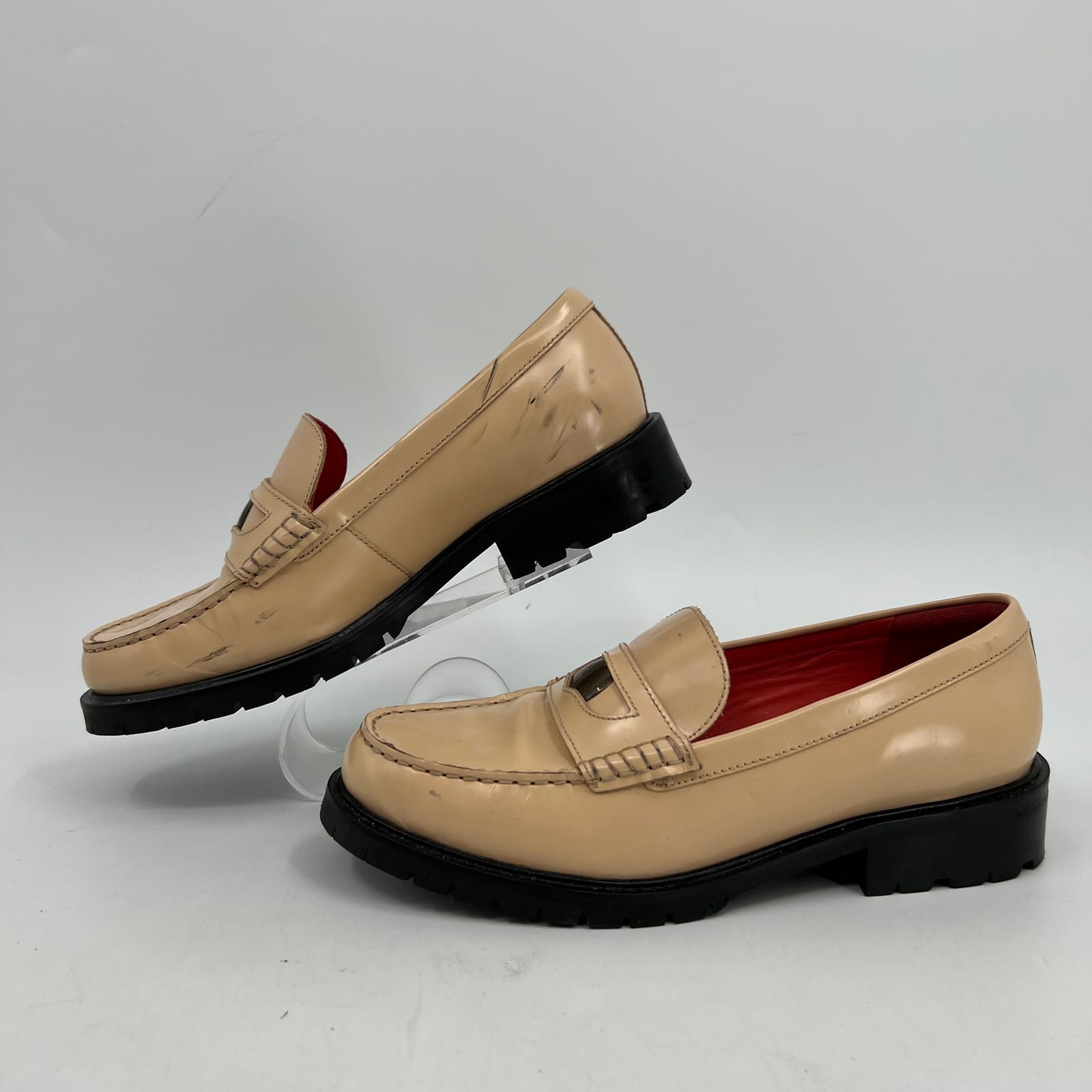 Step into a world of comfort and style with these Free People loafers, perfect for adding a splash of color to any outfit. These vibrant orange flats, also known as chic orange loafers or cozy orange slip-ons, are your ideal companions from the bustling city streets to a laid-back brunch. Feel the luxury of genuine leather as you embrace the classic round toe design, tailored to keep your feet happy all day long. Features: - Crafted from high-quality leather for durability - Versatile round toe design for timeless appeal - Suitable for all seasons: Winter, Spring, Summer, and Fall - Perfect for any occasion, from casual outings to office wear - Solid pattern with a classic theme for effortless pairing - Flaws: Some scuffs on right shoe, as pictured. - Inventory: 1085224 Don't miss out on these stunning orange loafers that promise both style and comfort. Slip into elegance today and let your feet do the talking!
