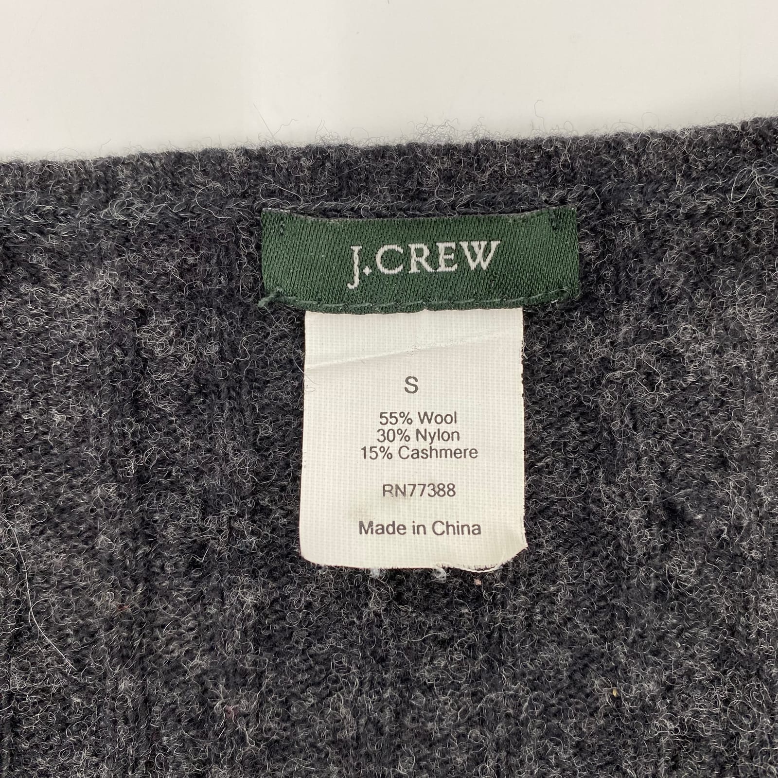 This gray wool cashmere blend V-neck sweater from J. Crew is soft, cozy, and refined enough for work or weekend wear. The lightweight knit feels plush against skin and layers beautifully over a tee or under a jacket. Made in China, it delivers warmth without bulk, keeping your silhouette polished from fall through winter and into spring. Features: - Wool-nylon-cashmere blend for warmth and softness - V-neckline for a flattering, timeless look - Pullover style with a smooth knit - Regular fit in size S for versatile layering - Solid gray—easy to pair with dresses, skirts, or denim - Approx. Measurements: Pit To Pit: 17 in, Length: 23 in - Inventory: 1126801 A classic you’ll reach for season after season.