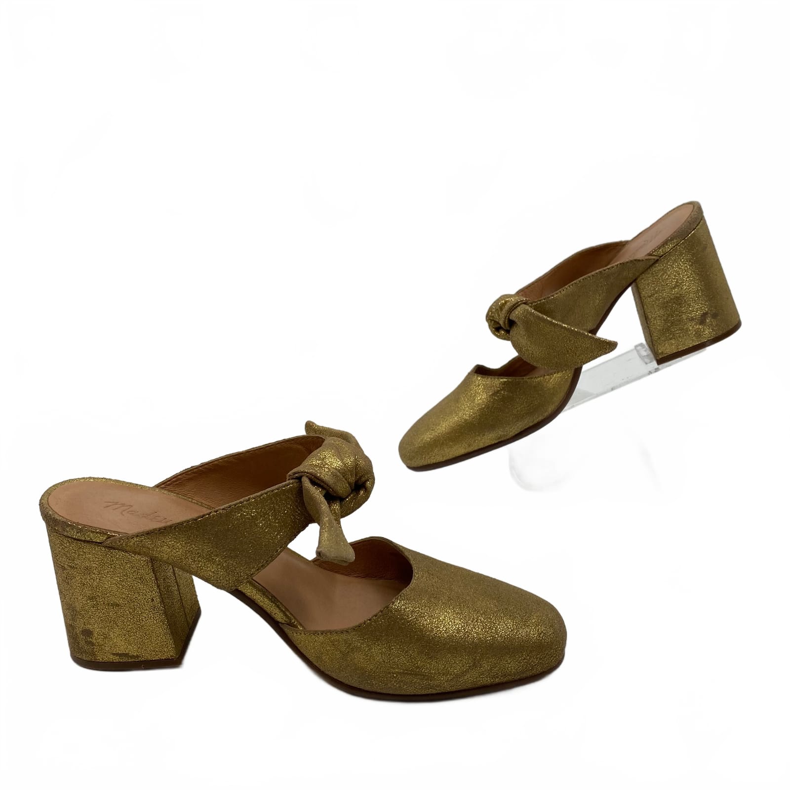 This Madewell leather pump adds timeless polish to your outfit. The gold-toned leather brings subtle shine, while the classic pump silhouette flatters every step. A delicate bow accent gives a sophisticated finishing touch. Comfortable enough for all‑day wear, these heels pair beautifully with dresses, skirts, or tailored pants for work or evening events. Features: - Leather upper for a premium feel - Bow accent adds refined charm - Gold tone for versatile evening wear - Heel height designed for all‑day wear - In‑store condition with signs of prior wear (good) - Flaws: Some signs of wear - Inventory: 1143391 A refined staple that elevates your closet—act fast before it’s gone.