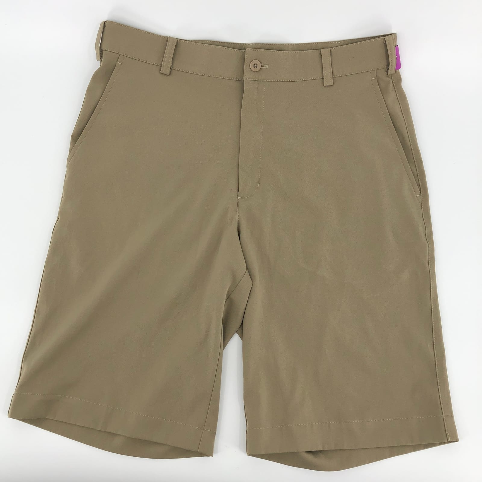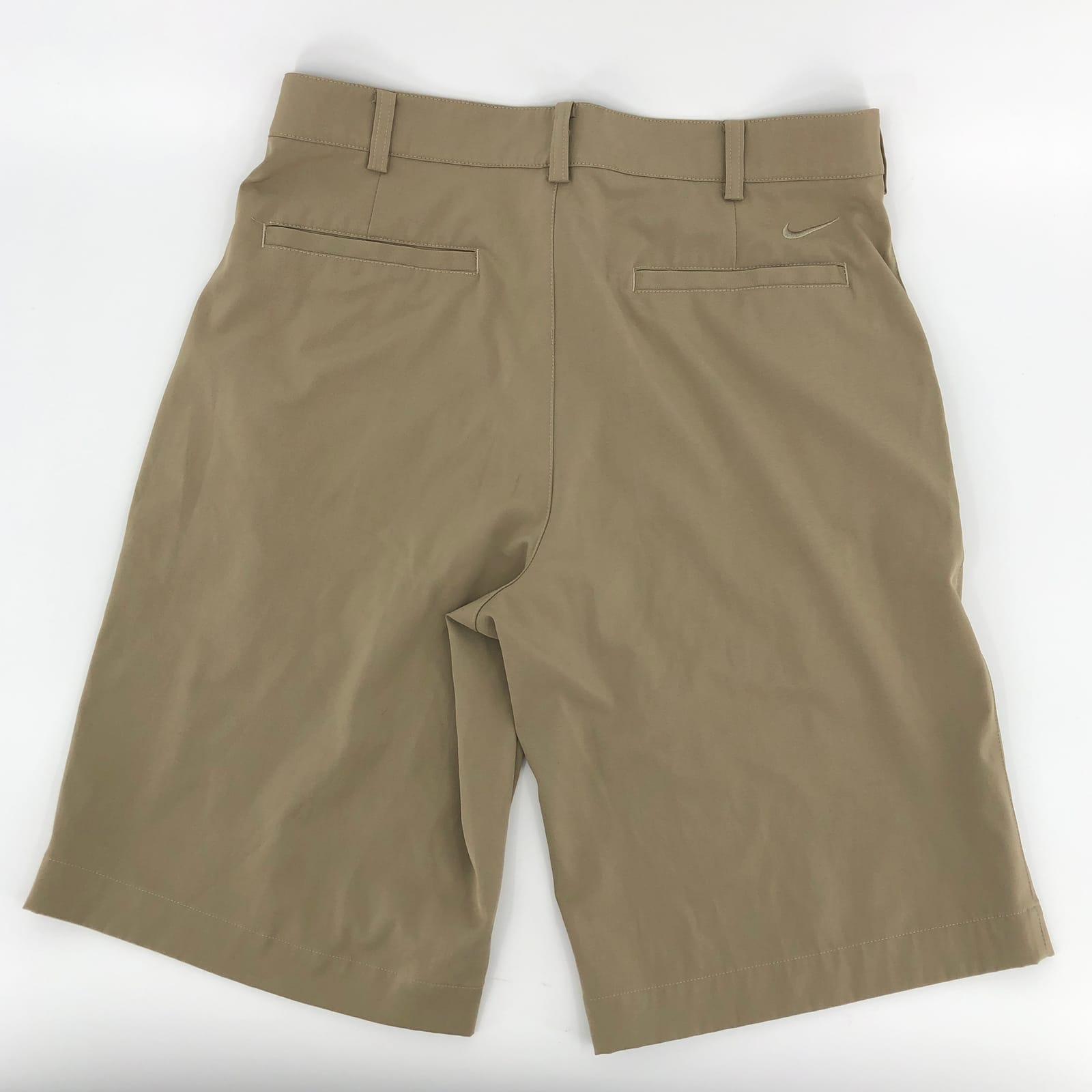 Swing into action with these Nike Beige High Rise Golf Shorts. Perfect for those sunny days on the green, these shorts offer a regular fit for ultimate comfort. Crafted from a blend of polyester and spandex, they provide just the right amount of stretch for your perfect swing. The beige color adds a touch of class to your golf attire, while the Nike Logo accent subtly showcases your brand preference. Ideal for any season, these shorts are a must-have for any golf enthusiast. Features: - High rise design for a comfortable fit - Made from a blend of polyester and spandex for durability and stretch - Ideal for golf activity, suitable for any season - Features pockets and a belted design for functionality and style - Accentuated with a Nike Logo for a touch of brand identity - Measurements: Inseam Measurement: 11, Waist Measurement: 32, Rise Measurement: 12 - Inventory: #07265 16206-8 Don't just play the game, own it. With these Nike Golf Shorts, you'll not only play in comfort, but you'll also do it in style. Elevate your golf game and wardrobe today. Get yours now before they're gone!