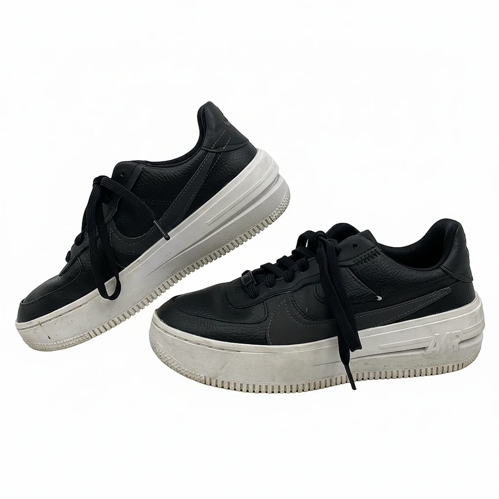 These Nike Air Force 1 Platform sneakers in black deliver classic street style with a bold platform lift. Made in Vietnam from durable leather, they offer everyday versatility for winter, spring, summer, or fall. Slight wear on the left lace area and outer soles is noted, but they remain ready to elevate your casual outfits with effortless comfort and a timeless silhouette. Features: - Leather upper for durability - Platform sole adds height and attitude - Classic Air Force 1 silhouette with modern platform - Regular US size 8 for women (Adult) - Solid black color pairs with everything - Flaws: Some dirt and scuffs on outer soles, as well as wear near laces on left shoe, as pictured. - Inventory: 1143192 Own the look before it steps out of reach.