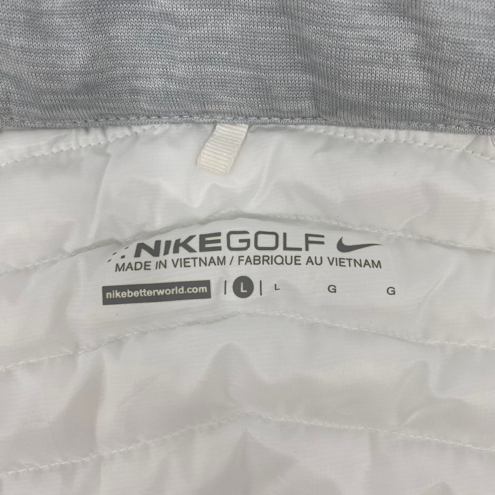 This Nike Golf Aeroloft puffer keeps you warm without the bulk. Lightweight insulation and a sleek, solid shell make it ideal for layering through winter, while its breathable design helps you stay comfortable in transitional seasons. The white and gray colorway matches everything, and the regular L fits true to size for everyday wear. Features: - Made with lightweight polyester insulation - Solid white-gray shell for easy pairing - Regular fit size L with breathable warmth - Aeroloft quilted construction for even heat distribution - Suitable for winter, spring, and fall wear - Approx. Measurements: Pit To Pit: 20 in, Length: 23 in - Inventory: 1143105 A limited find that won’t stay on the rack long.
