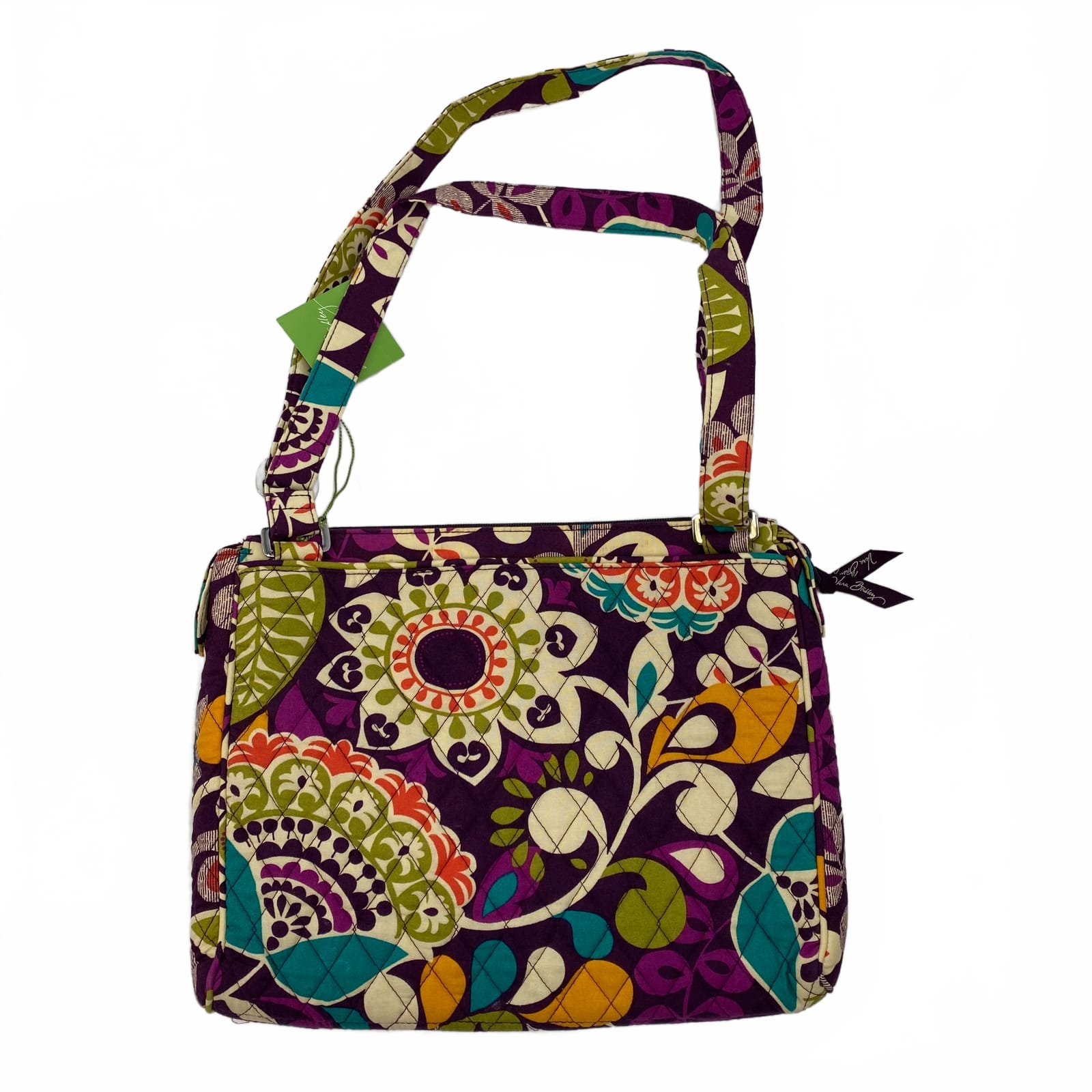 A classic Vera Bradley shoulder bag in a rich purple hue, crafted from a durable cotton blend. Light enough for everyday use, with versatile storage that keeps essentials organized. Perfect for work, errands, or weekend getaways, this bag pairs easily with your go-to outfits across seasons. Features: - Cotton blend construction for comfortable everyday wear - Shoulder bag style with easy-access front pocket - One size (OS) fits daily essentials without bulk - Vera Bradley classic pattern options in purple tones - Lightweight and durable for year‑round use - Approx. Measurements: Bag Height: 10 in, Bag Width: 13 in - Inventory: 1138444 This is your everyday go-to bag with true Vera Bradley charm.