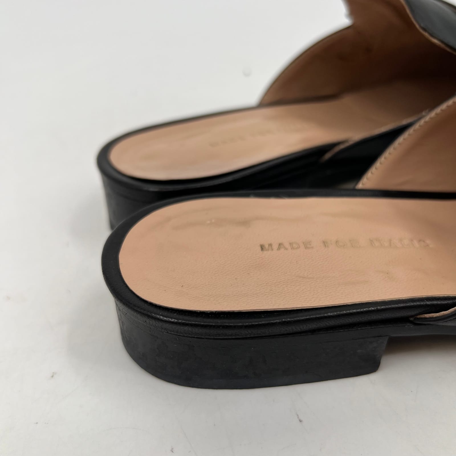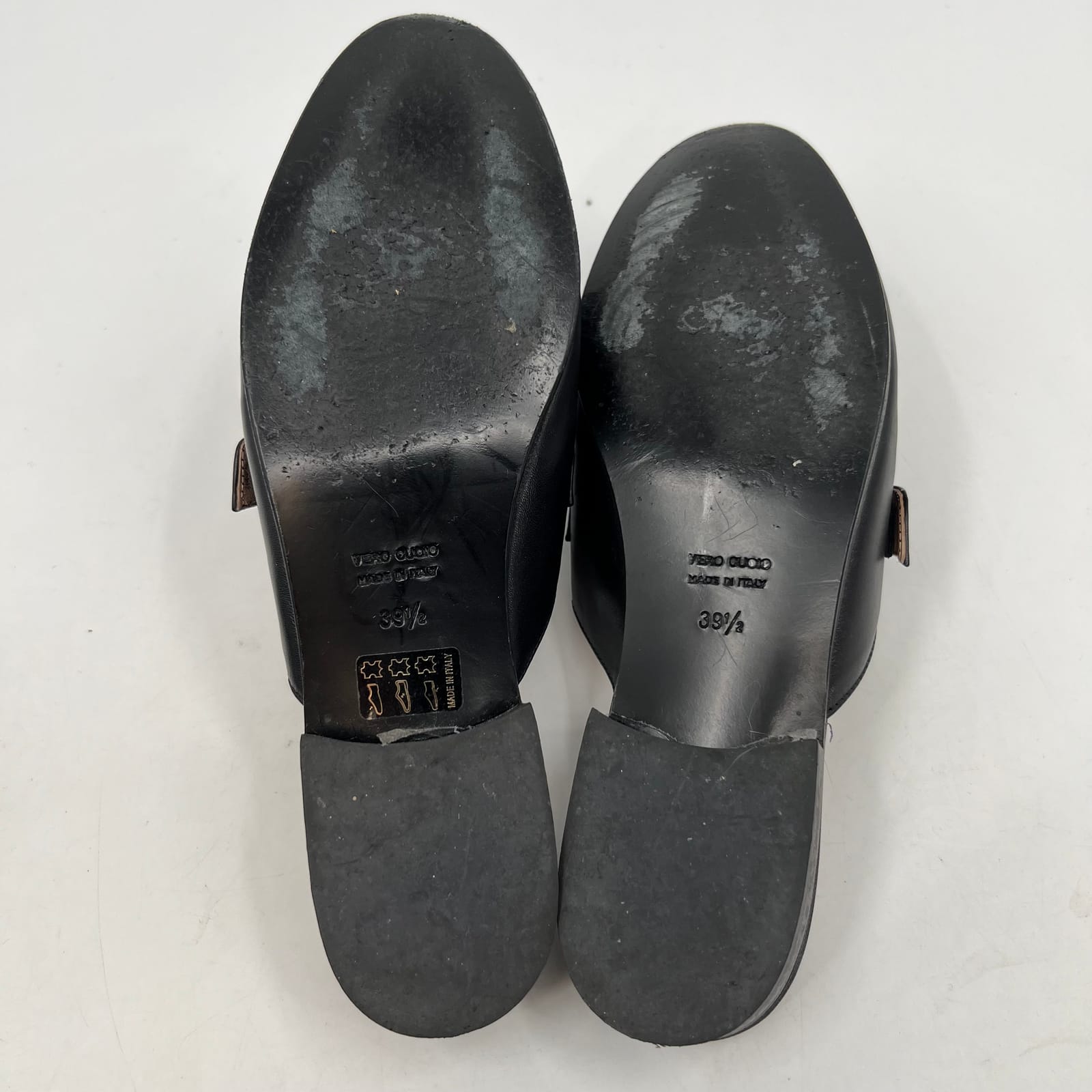 Step into timeless elegance with these Vero Cuoio Black Buckle Detail Mule Loafers. Perfect for any occasion, these leather beauties boast a classic loafer style with a modern mule twist. Whether you call them mule loafers, slip-on clogs, or round-toe flats, these shoes will become your go-to choice for spring, summer, and fall. Get ready to turn heads and feel fabulous with every step! Features: - Made in Italy - High-quality leather material - Chic buckle accents - Versatile round toe design - Ideal for any occasion - Flaws: Inner soles are beginning to peel from shoe, but could easily be glued down, as pictured. - Inventory: 1065821 Don't miss out on adding these classic Vero Cuoio Black Mule Loafers to your collection! Step up your shoe game and grab them before they're gone!