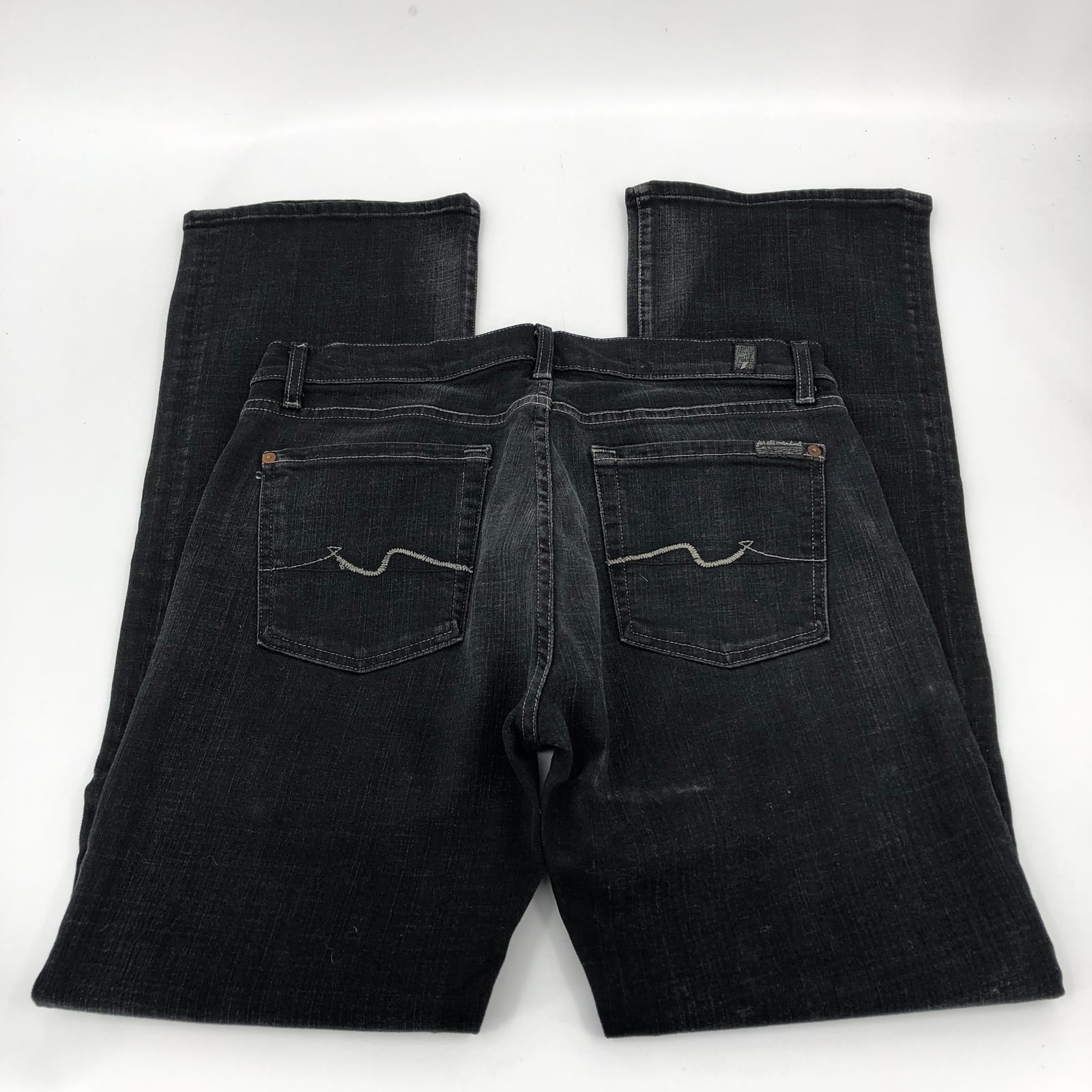 Strut your stuff in these chic 7 For All Mankind black wide-leg jeans. With a flattering high rise and a sleek dark wash, these jeans are perfect for any occasion. Made in the United States, they're a great way to show off your fashion-forward style while supporting domestic manufacturing. Their versatile solid pattern makes them a wardrobe staple, ready to pair with almost anything in your closet. So why wait? Add some flair to your denim collection today! Features: - High rise style for a flattering fit - Versatile solid pattern - Suitable for all seasons - Winter, Spring, Summer, Fall - Perfect for any occasion, casual or otherwise - Made from a comfortable cotton-polyurethane blend - Approx. Measurements: Inseam Measurement: 32, Rise Measurement: 11, Waist Measurement: 33 - Inventory: #07872 These 7 For All Mankind black wide-leg jeans are a must-have for any fashionista. Their high rise and dark wash make them a versatile addition to any wardrobe. So why wait? Elevate your style and make them yours today!