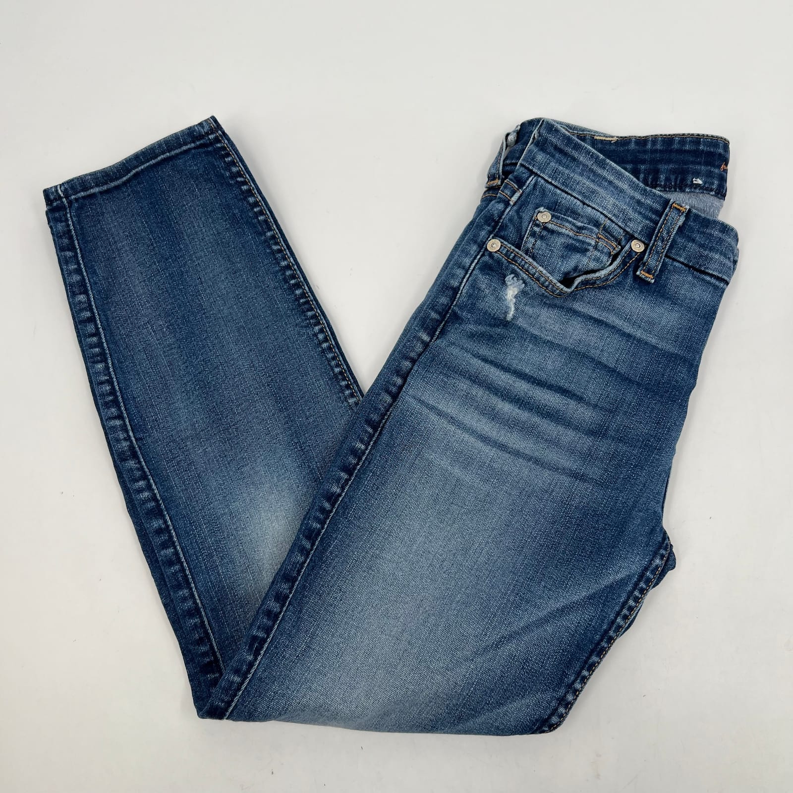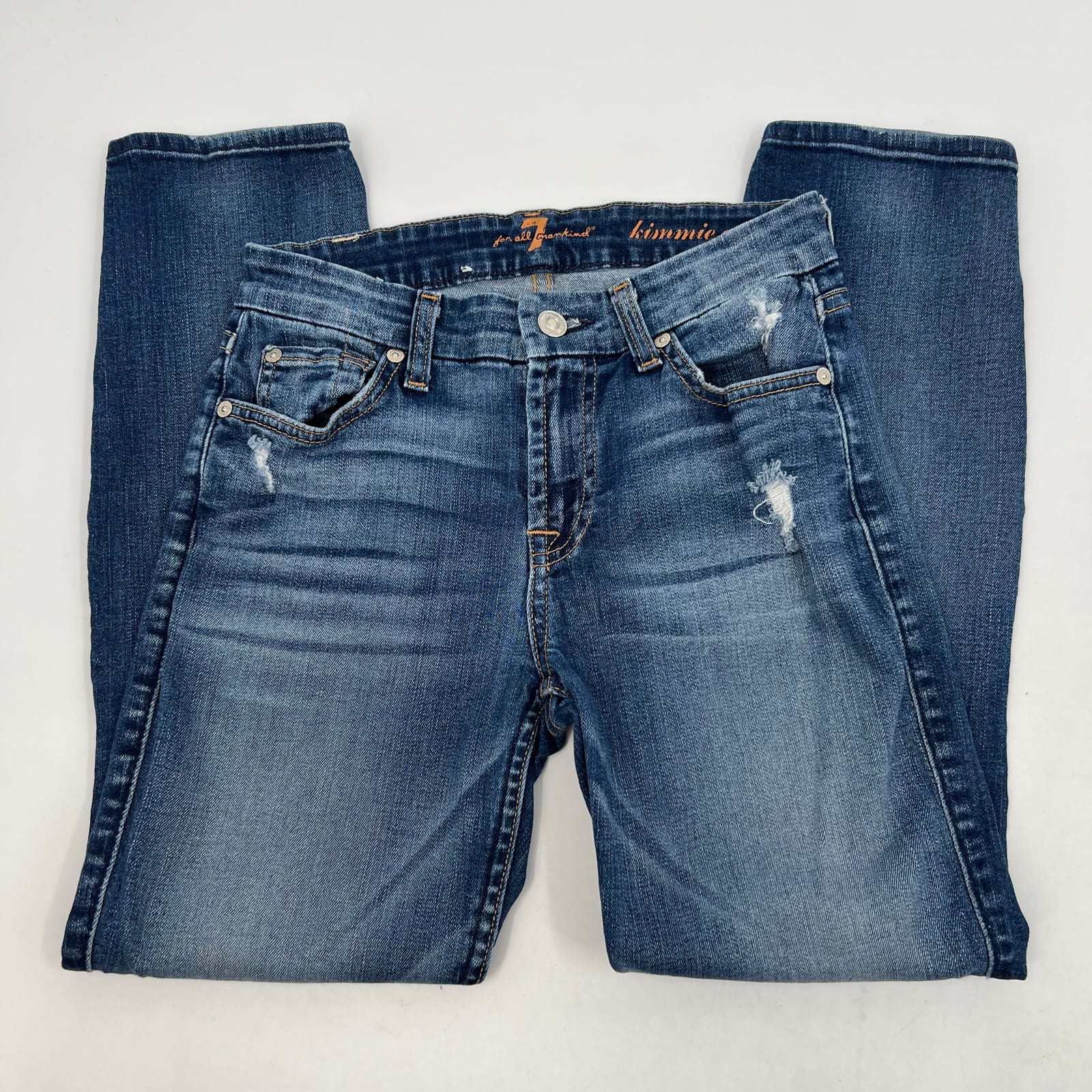 Step out in timeless style with these 7 For All Mankind blue medium wash Kimmie crop jeans. Perfectly tailored to hug your curves and hit just above the ankle, these jeans are a must-have for any fashion-forward wardrobe. With a broken-in feel and a classic blue wash, they're just the right mix of casual and chic. And don't worry about that broken leather loop - it adds an extra touch of vintage charm and doesn't affect the wear at all. From brunch dates to shopping trips, these jeans are ready for any occasion. Features: - Made in the United States - Cotton and Spandex blend for comfort and stretch - Low rise (6.5-8.5 in) for a trendy silhouette - Versatile medium wash denim - Perfect for Any Season - Approx. Measurements: Inseam Measurement: 24 in, Waist Measurement: 25 in, Rise Measurement: 8 in - Flaws: Leather loop on back broken, as pictured, but doesn’t affect wear. - Inventory: 1038075 #08648 Don't miss out on these 7 For All Mankind blue medium wash Kimmie crop jeans. They're the perfect blend of comfort, style and versatility. Get them today and add a touch of classic charm to your wardrobe!