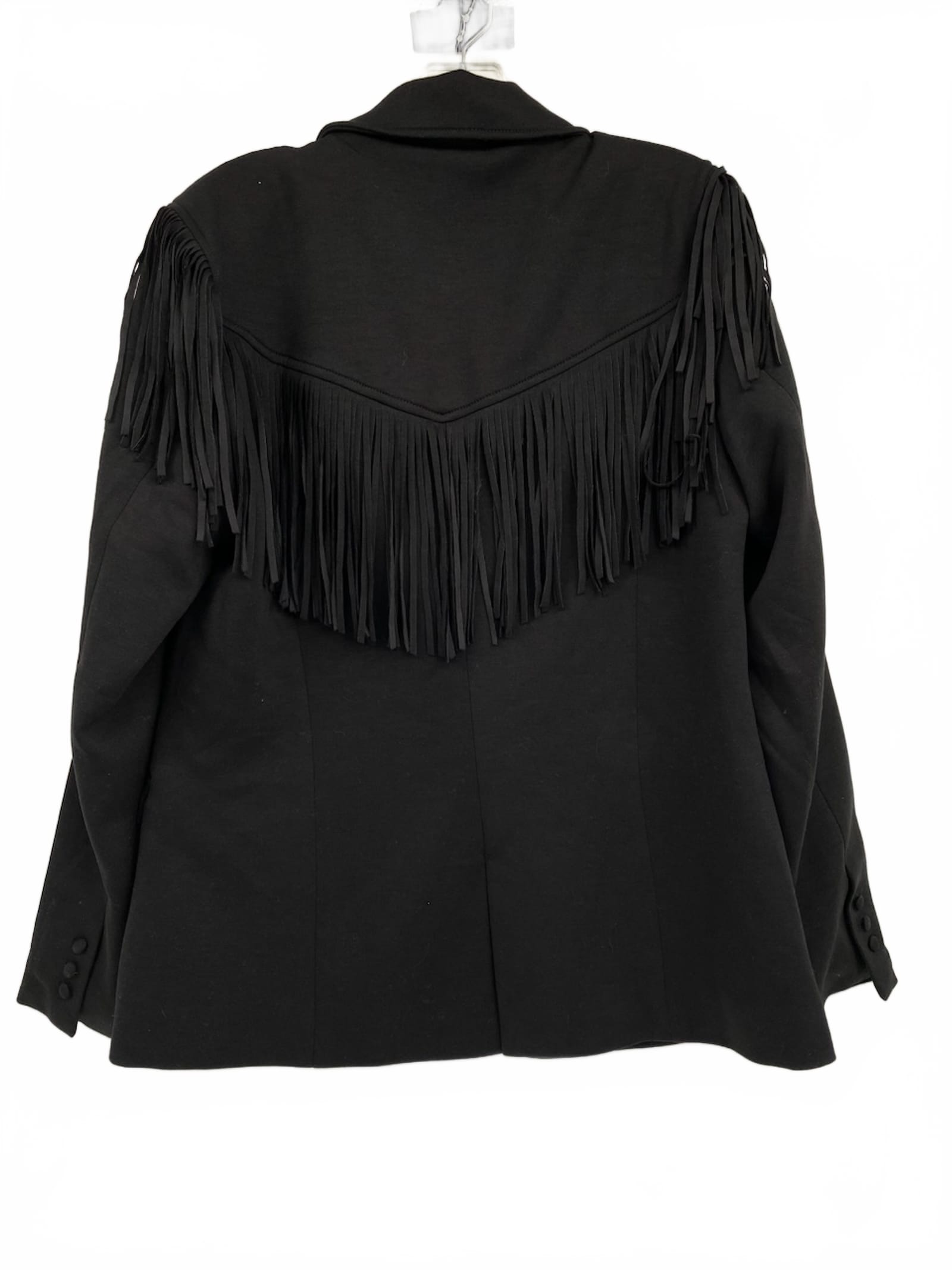 This solid black kids’ jacket from Blank NYC combines classic formal style with practical details. Made with a blend that includes polyester, rayon, and spandex, it offers comfort and a polished silhouette for any event. Shoulder pads help maintain a crisp shape, pockets add everyday convenience, and a fringe accent adds subtle personality. A versatile piece that layers well over shirts and sweaters for winter through fall wear. Features: - Made from polyester, spandex, and rayon for stretch and comfort - Shoulder pads help the jacket hold its structured shape - Has functional pockets for small essentials - Fringe accent adds a refined, playful touch - Solid black with classic tailoring for formal occasions - Approx. Measurements: Pit To Pit: 21, Length: 29.5 - Inventory: 1142179 This is the go-to formal layer your kid will reach for again and again.