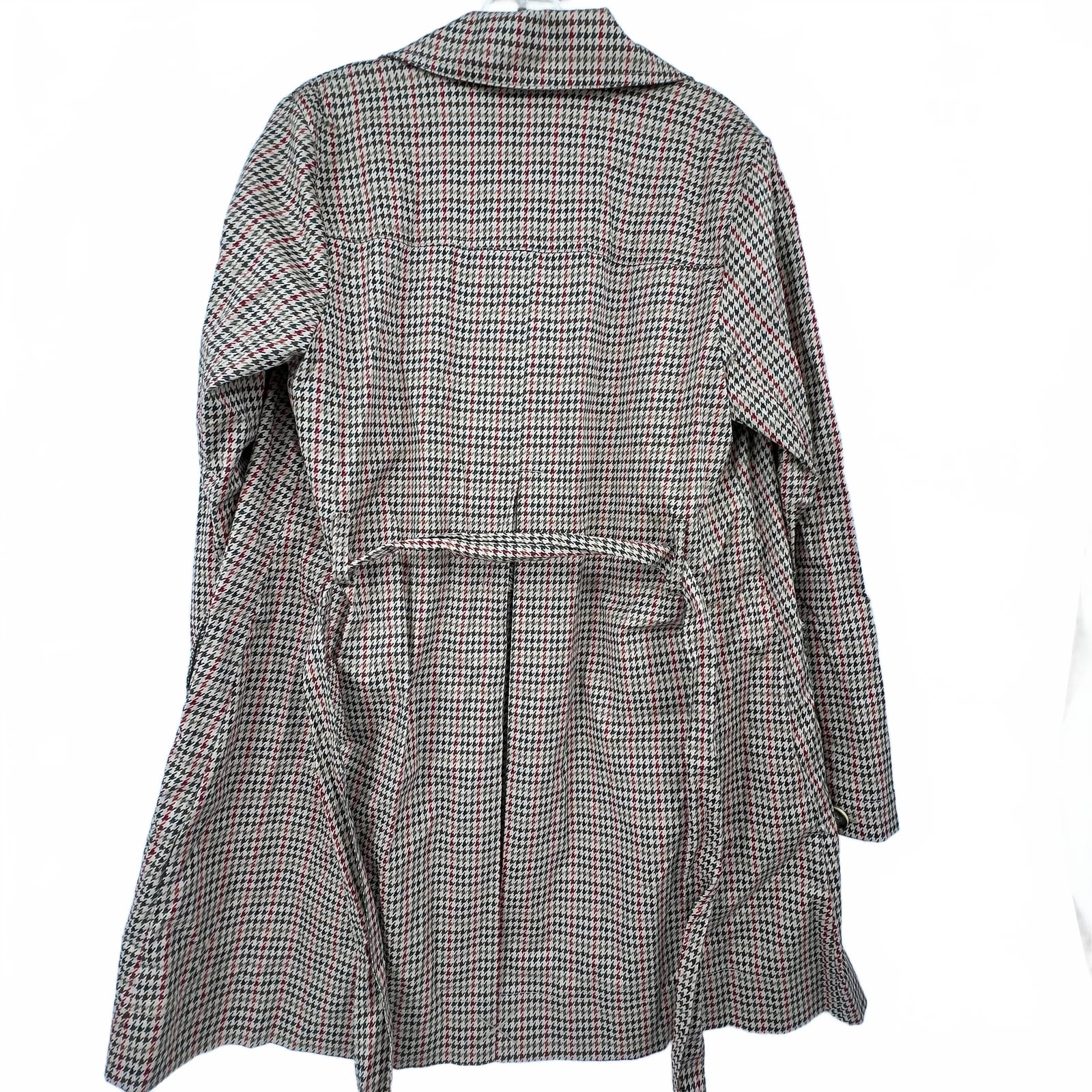 This trench coat blends timeless style with practical warmth. The cotton-spandex blend offers a comfortable, tailored fit that moves with you, while the tan and red houndstooth pattern adds a polished touch to any outfit. Perfect for fall days, it layers easily over sweaters and dresses alike, giving you a put-together look from commute to evening out. Features: - Cotton-spandex blend for comfortable stretch - Outer shell in cotton for a structured feel - Classic trench silhouette with a timeless houndstooth pattern - Fall-ready coat that layers well over knits and dresses - Secure details with practical pockets and tailored fit (note: loose thread on left pocket button) - Approx. Measurements: Pit To Pit: 20, Length: 34 - Flaws: Loose thread on left pocket button, as seen in photos - Inventory: 1081567 Own the look before it disappears from stock.