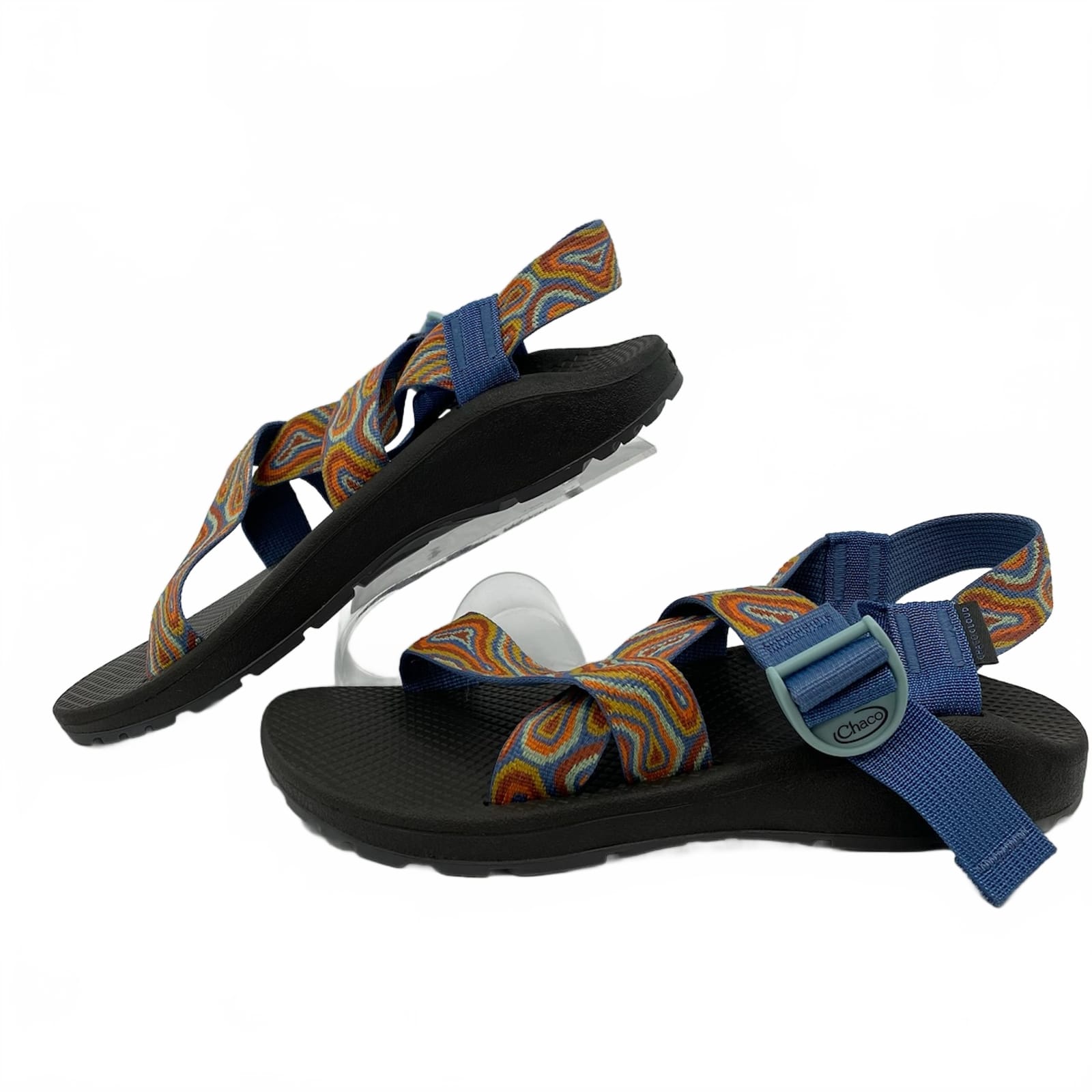 Step into sunny days with these Chaco sandals. The strappy nylon upper sits securely on your foot, while textile detailing adds soft comfort for warm-weather adventures. Perfect for daytime strolls, beach walks, or casual outings, these durable sandals move with you from spring to fall. Slip them on, enjoy breathable comfort, and let the bold blue and orange agate accents brighten every step. Features: - Nylon strappy upper for secure fit - Textile lining for everyday comfort - Durable outsole designed for warm-weather wear - Bold blue and orange agate colorway adds pop - Regular US size 10 for versatile fit - Inventory: 1136959 A limited pair that brings classic style to your sunny season.