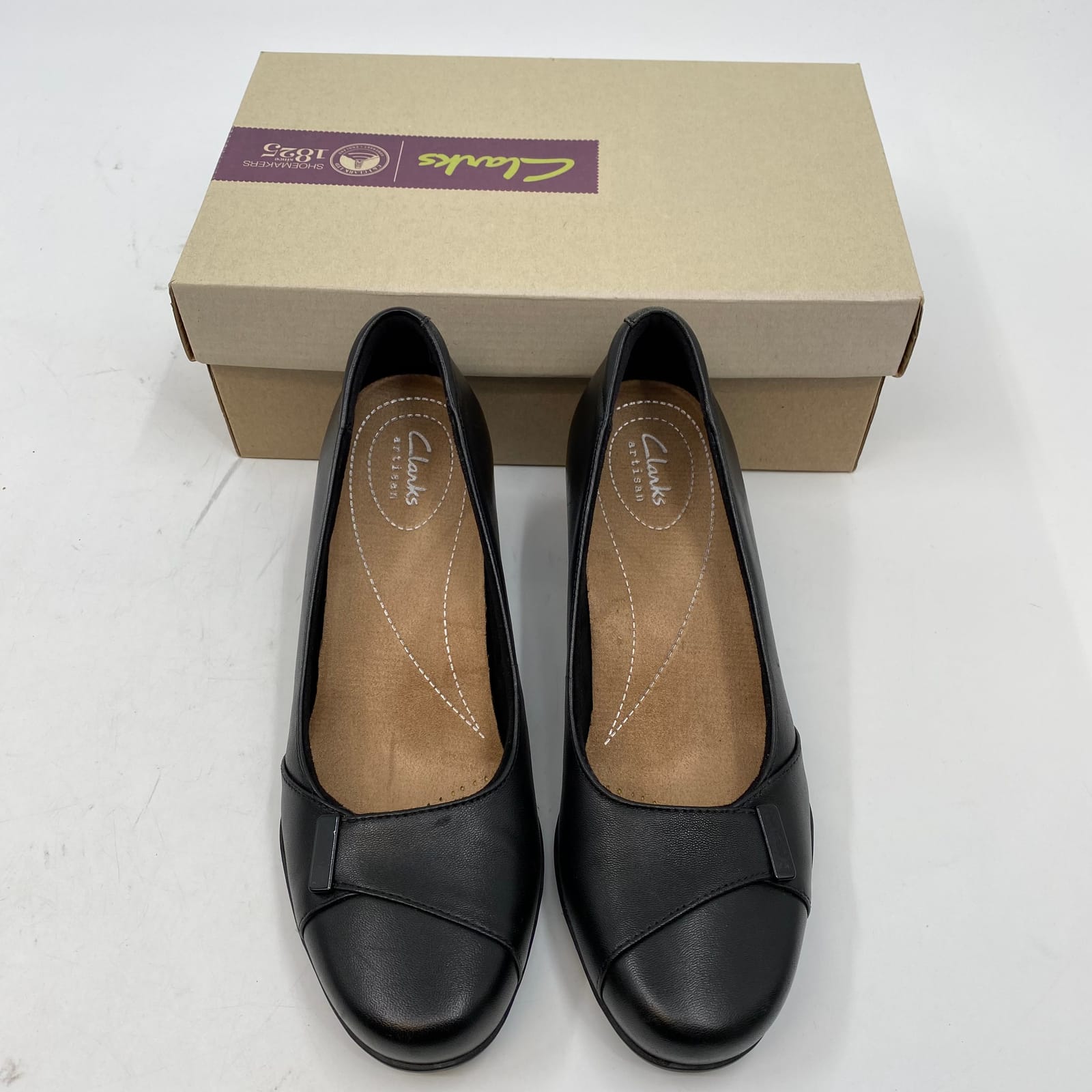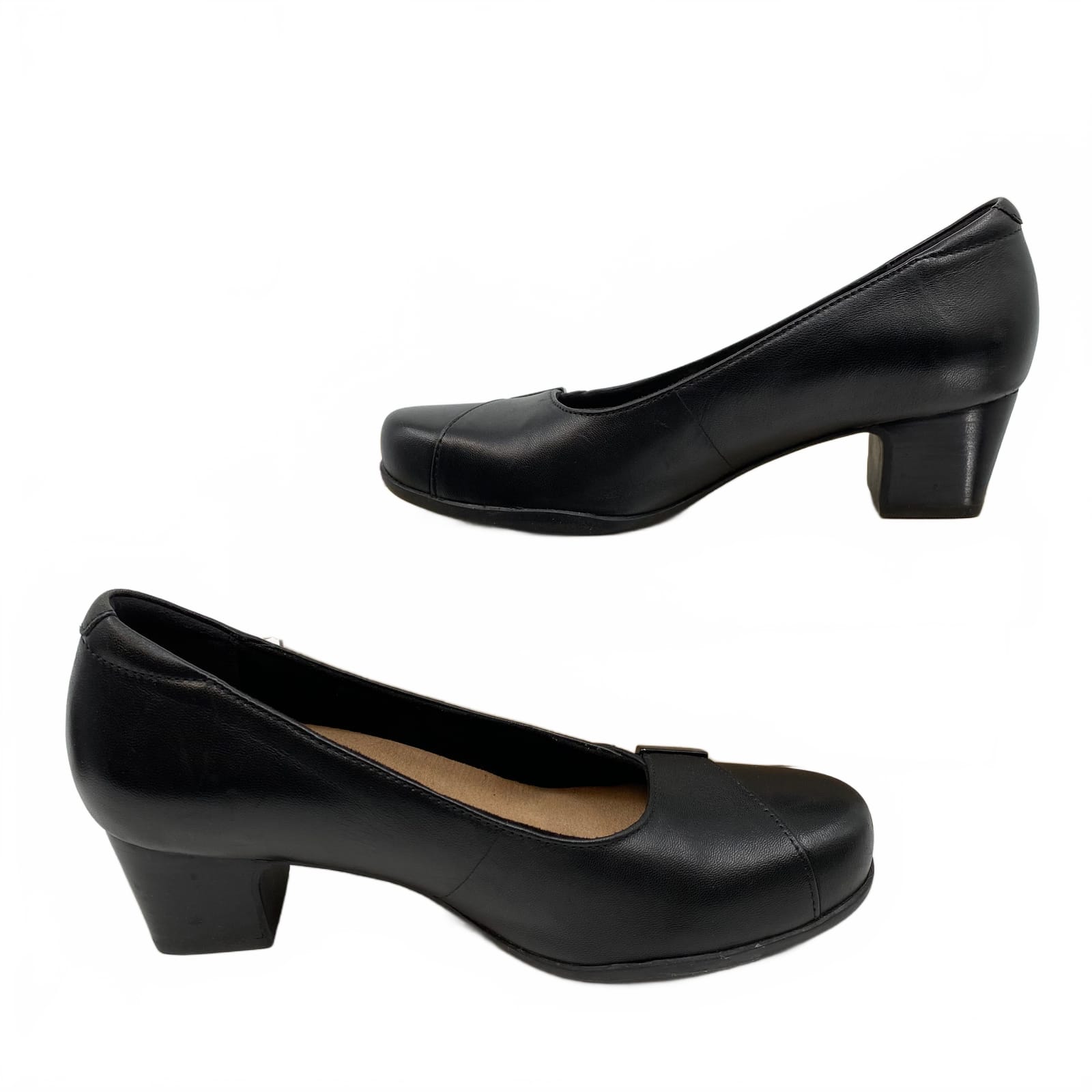 Step into timeless polish with these Clarks black leather pumps. Crafted from smooth leather, they offer a comfortable fit for all-day wear and a classic silhouette that elevates dresses, skirts, or tailored looks. The pump’s clean lines and versatile black shade keep your wardrobe easy to mix and match, while a comfortable heel height provides confident steps from desk to dinner. Perfect for fall, winter, or any season you want a refined finish. Features: - Leather upper for durability and a polished look - Classic pump silhouette with versatile black color - Regular US size 7 for a balanced fit - Heel designed for stability and comfort during extended wear - Made in China and built to last across seasons - Inventory: 1142508 A timeless choice that won’t slow you down—make it yours before it’s gone.