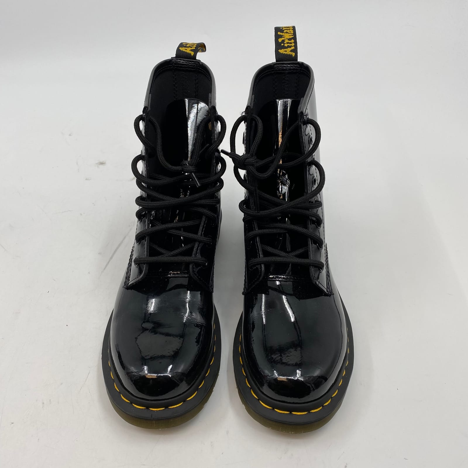 These iconic patent leather combat boots from Dr. Martens deliver edgy style with durable, all-day comfort. Made in Vietnam, they pair effortlessly with dresses, jeans, or leggings for a bold, versatile look in every season. The glossy black finish adds a sleek touch to any outfit, while the sturdy sole and signature air-cushioned comfort keep you stepping confidently from spring through winter. Features: - Patent leather upper for a bold, glossy finish - Durable construction with classic Doc Martens outsole - Made in Vietnam with trusted quality - Regular US size 7 for women - Versatile combat style suitable for many looks and occasions - Inventory: 1142448 A limited find in this condition—lock in your bold, timeless pair before they’re gone.