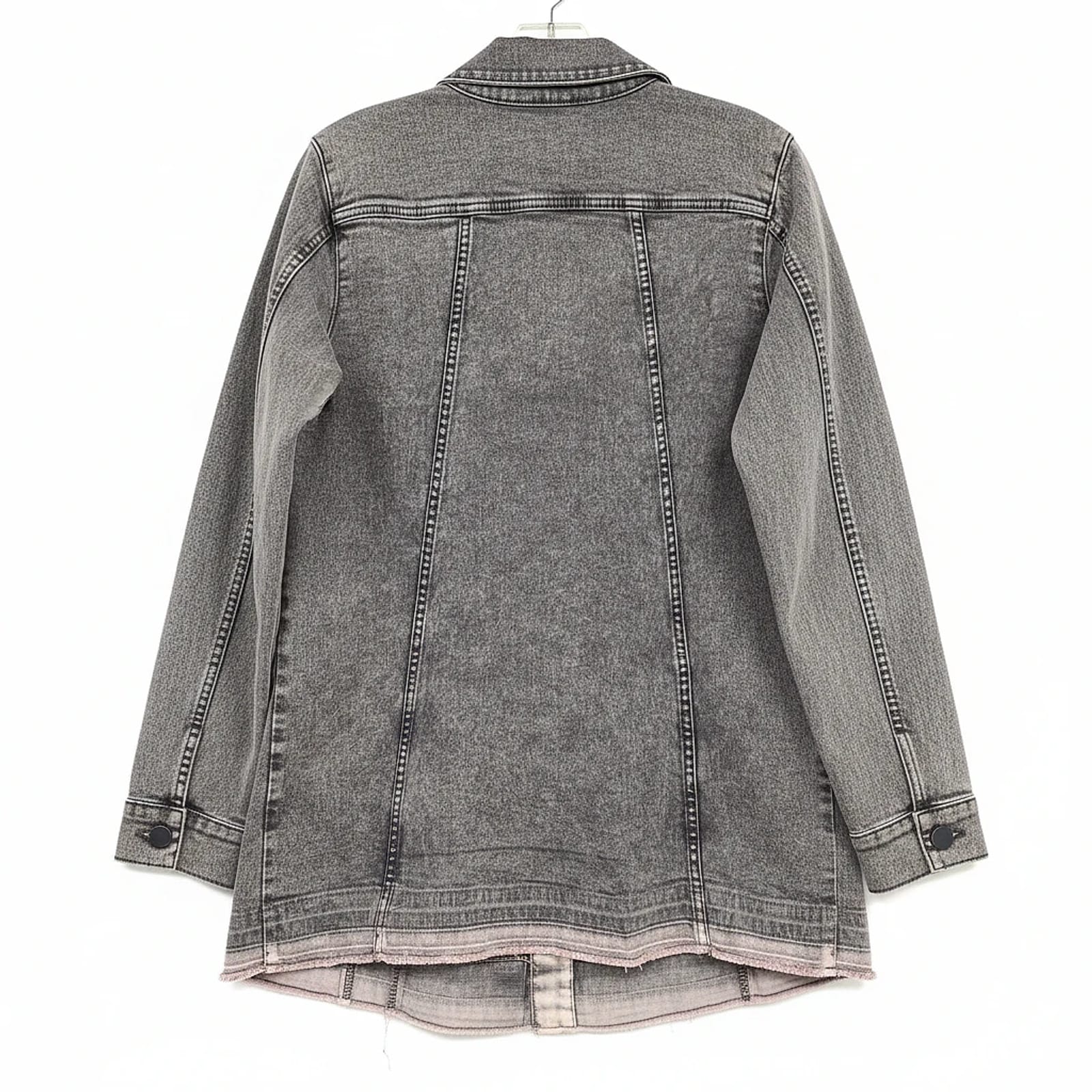 This LOGO by Lori Goldstein gray release-hem denim jacket brings timeless utility to your wardrobe. Built with a cotton blend for durability and comfort, it layers easily over tees or knit tops for crisp day-in, day-out style. A classic solid jacket that pairs with jeans, dresses, or joggers, it’s ready for winter, spring, or fall wear. Features: - Cotton-polyester blend for durability and comfort - Outer shell made from cotton for a classic denim feel - Release hem adds subtle texture and shape - Solid gray, versatile for any top or dress - Regular fit with practical, everyday styling - Approx. Measurements: Pit To Pit: 19 in, Length: 29 in - Inventory: 1142397 A limited drop that complements your entire wardrobe.