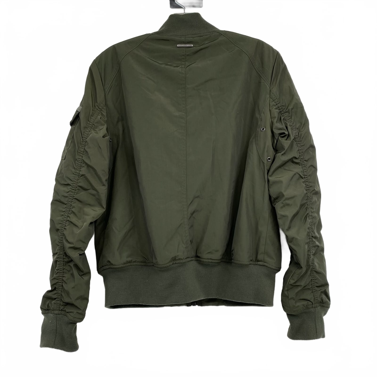 This Marc Jacobs bomber jacket is your perfect companion for chilly outings. With its soft, fuzzy lining and classic bomber style, you’ll stay cozy while looking effortlessly chic. Ideal for layering over your favorite tees or dresses, it’s versatile enough for any occasion, from casual meetups to night out in the city. Features: - Crafted from a durable blend of polyester and nylon - Fuzzy lining for added warmth and comfort - Classic bomber silhouette with ribbed cuffs - Suitable for winter, spring, and fall wear - Timeless solid green color complements any outfit - Approx. Measurements: Pit To Pit: 19.5 in, Length: 23 in - Inventory: 1132554 A limited find that won’t hang around long.