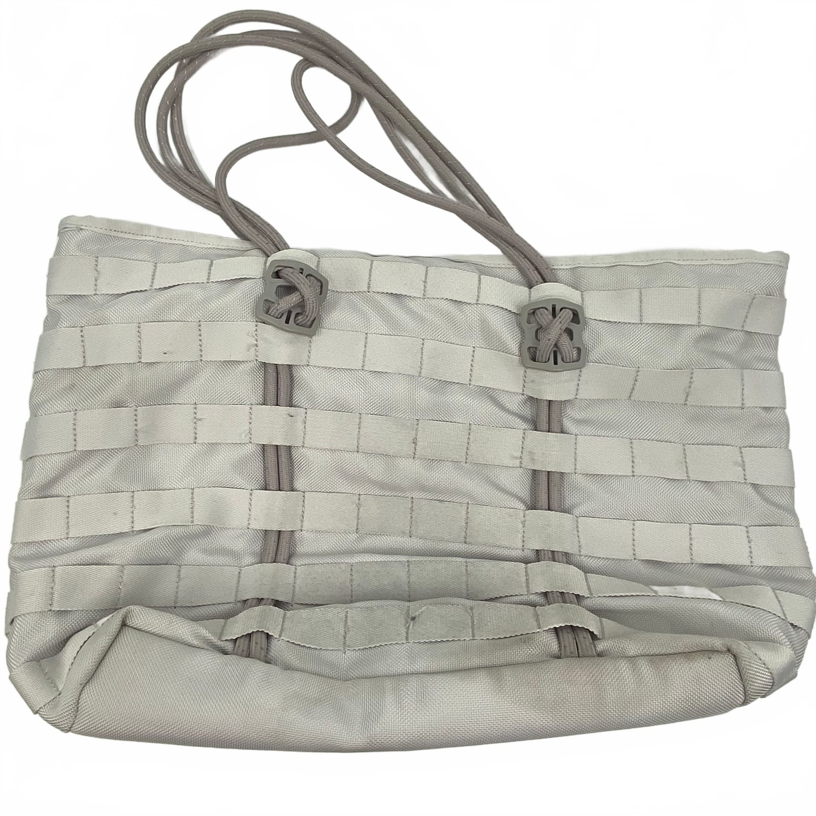 This Nike tote carries your essentials with practical organization. Made from durable polyester, it features inner pockets to keep keys, phone, and lip balm within reach. The cloud gray exterior with black accents pairs with any outfit, and its regular size fits daily must-haves without weighing you down. A versatile tote for work, travel, or weekend errands. Features: - Polyester construction for everyday durability - Inner pockets keep small items organized - Regular OS size fits daily essentials - Cloud gray exterior with black accents for easy styling - Lightweight, versatile tote for work or travel - Approx. Measurements: Bag Height: 15 in, Bag Width: 21 in, Bag Depth: 6 in - Flaws: Stains and marks as seen in photos - Inventory: 1139414 A practical tote that blends function with everyday style.