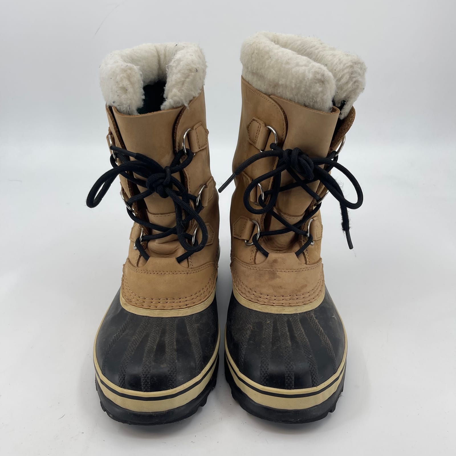 Step into the season with confidence and style with these Sorel Tan & Black Caribou Waterproof Winter Boots. Designed to keep your feet cozy and dry, these boots are perfect for those chilly winter days or rainy spring afternoons. The lace-up closure ensures a snug fit, while the leather upper adds a touch of sophistication. With a solid pattern and classic theme, these boots are as fashionable as they are functional. So why wait? Embrace the elements and make a statement with these Sorel boots. Features: - Made in Vietnam - Upper material: Leather - Heel style: Platform - Toe shape: Round - Suitable for any occasion - Flaws: Upper leather has some creasing and dirt marks. Rubber midsoles have dirt throughout. - Inventory: S068 8472-844 Don't let the weather dictate your style. With these Sorel Tan & Black Caribou Waterproof Winter Boots, you can look chic and stay warm, no matter the season. Order now and step out in style!
