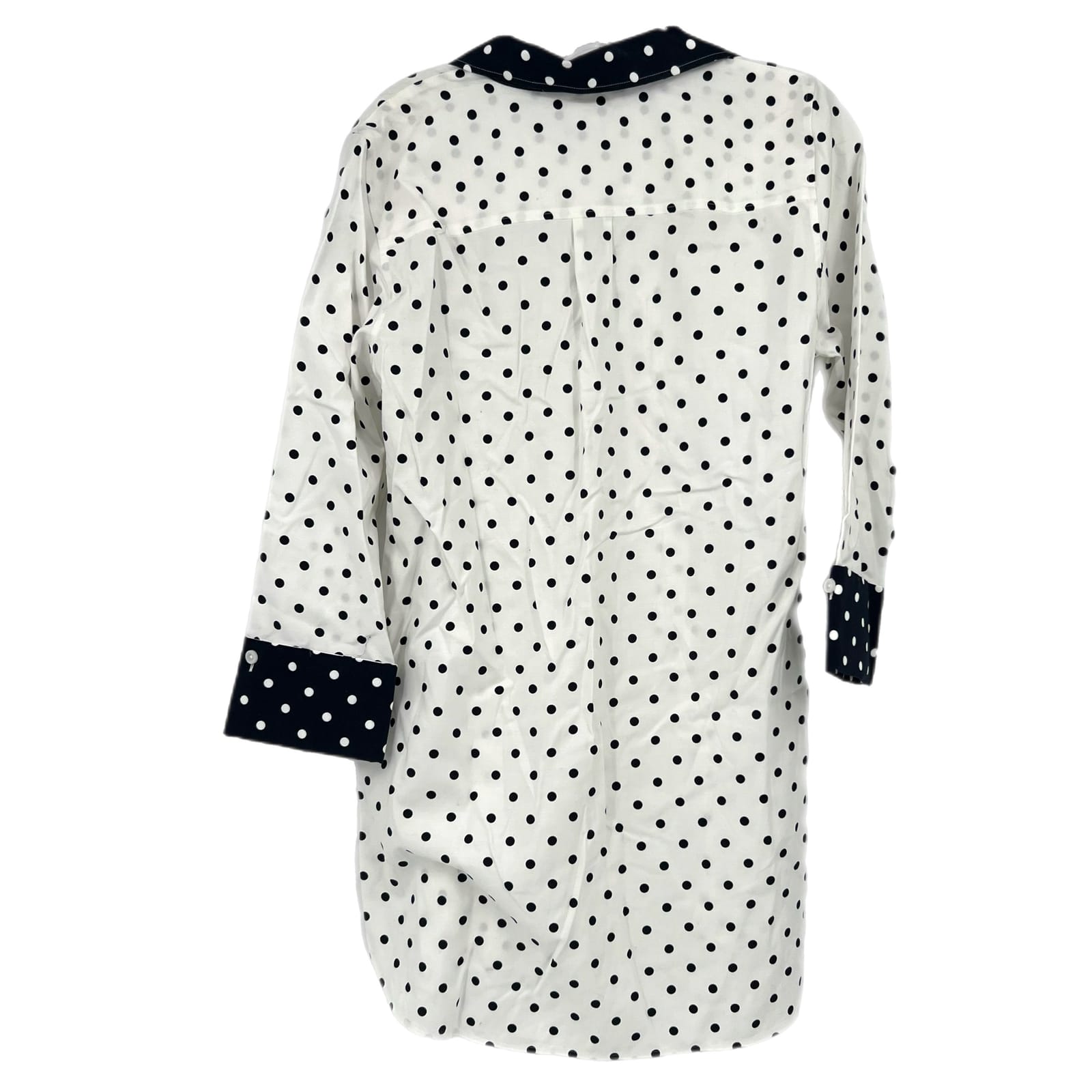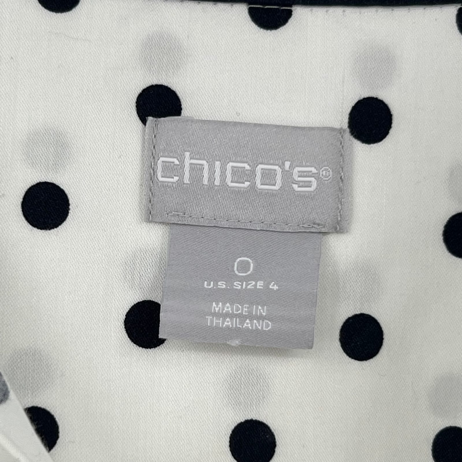 Elevate your wardrobe with this classic black and white polka dot blouse from Chico's. Made from soft cotton, it keeps you comfortable whether you're heading to the office or enjoying a casual weekend outing. The timeless pattern adds a playful touch to any ensemble, making it easy to pair with your favorite jeans or tailored pants. Features: - Crafted from 100% breathable cotton - Versatile design for any occasion - Lightweight fabric suitable for year-round wear - Classic polka dot pattern for a chic look - Perfectly tailored for a flattering fit - Approx. Measurements: Pit To Pit: 19, Length: 30 - Inventory: This style staple won't last long—make it yours today.