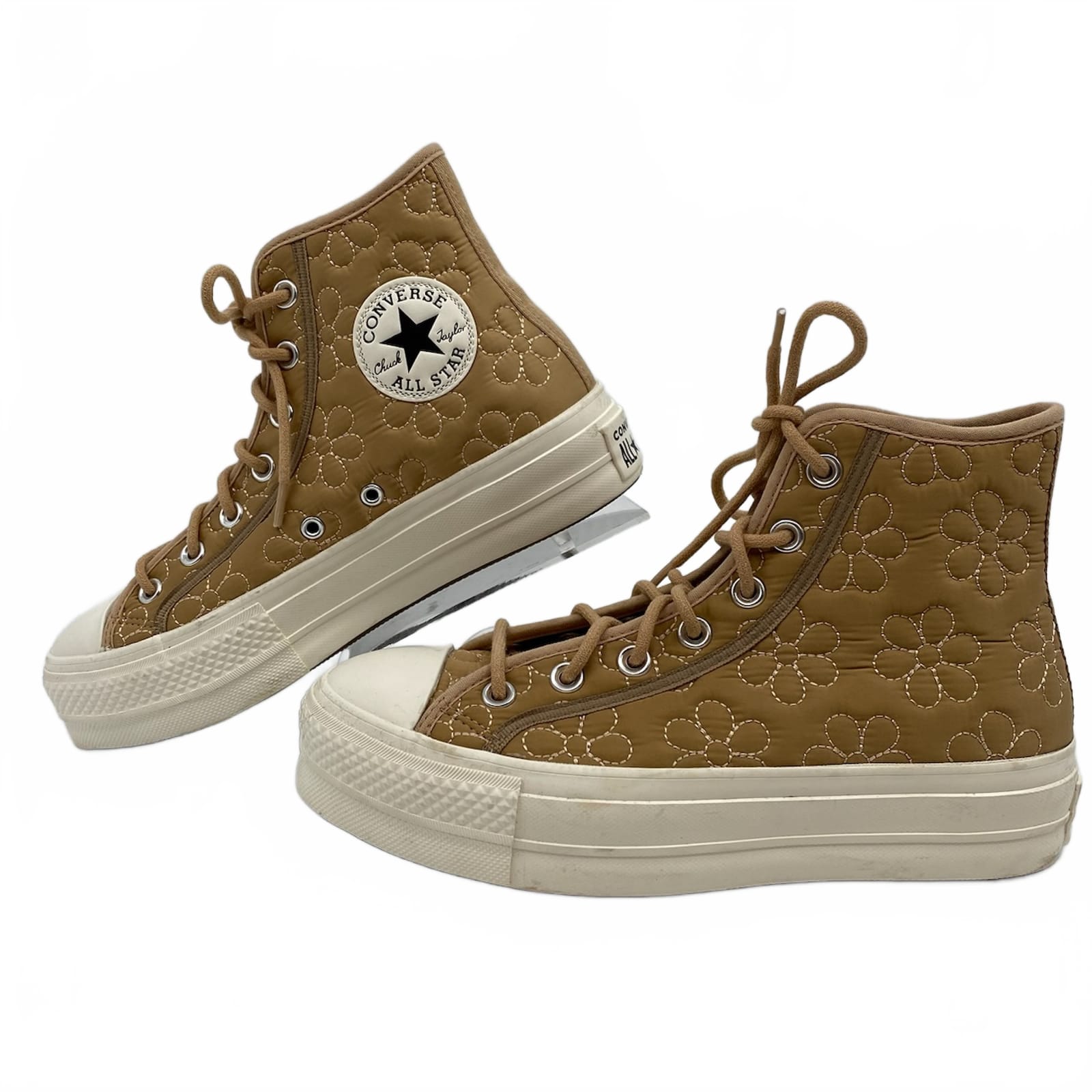 Step up your everyday look with these Converse Tan Quilted Flower High Top Sneakers. Lightweight textile upper, durable rubber sole, and a playful floral quilting detail bring casual comfort and subtle charm to any outfit. Versatile for winter through fall, they pair easily with jeans, skirts, or joggers for an effortless, put-together vibe. Features: - Textile upper for breathable comfort - Durable rubber outsole for traction - Quilted floral detail adds a soft, unique touch - Classic high-top silhouette with versatile tan shade - Made in Vietnam with solid, reliable construction - Flaws: Some very light scuffs on outer soles, as pictured. - Inventory: 1136800 A stylish favorite that won’t stay on the shelf for long.