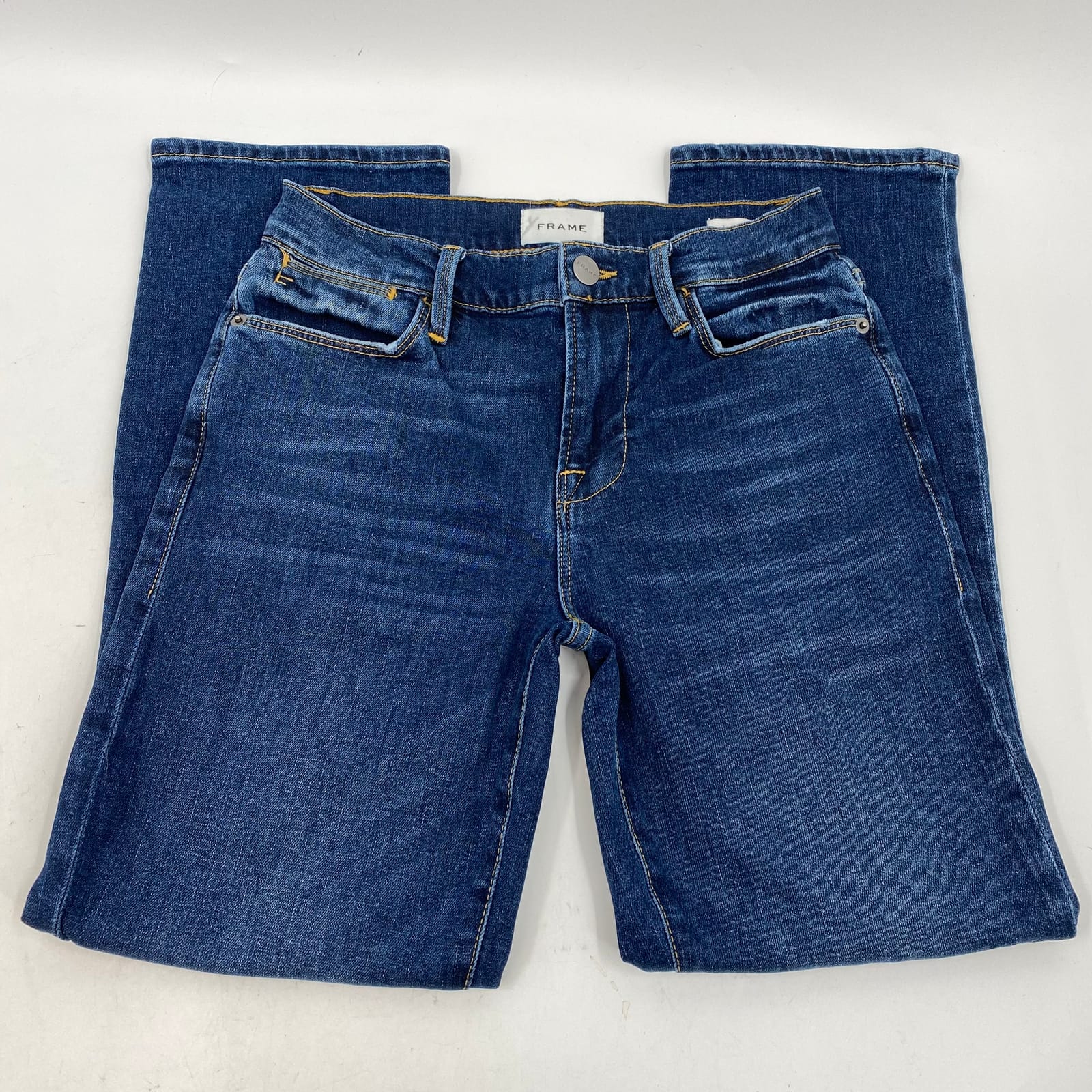 These Frame Denim Le High straight leg jeans are your essential wardrobe staple for any occasion. Crafted from a blend of cotton, lyocell, and polyester, they offer both comfort and style in a rich dark wash. Effortlessly versatile, these jeans pair seamlessly with everything from a casual tee to a chic blouse, making them perfect for brunch dates or evening outings. Features: - Constructed from a soft cotton-lyocell blend - Mid-rise design for a flattering fit - Classic straight leg cut for timeless appeal - Dark wash denim adds sophistication - Suitable for year-round wear - Approx. Measurements: Inseam Measurement: 26 in, Waist Measurement: 25 in, Rise Measurement: 9 in - Inventory: 1126052 Only one pair available—claim your style before it’s gone.