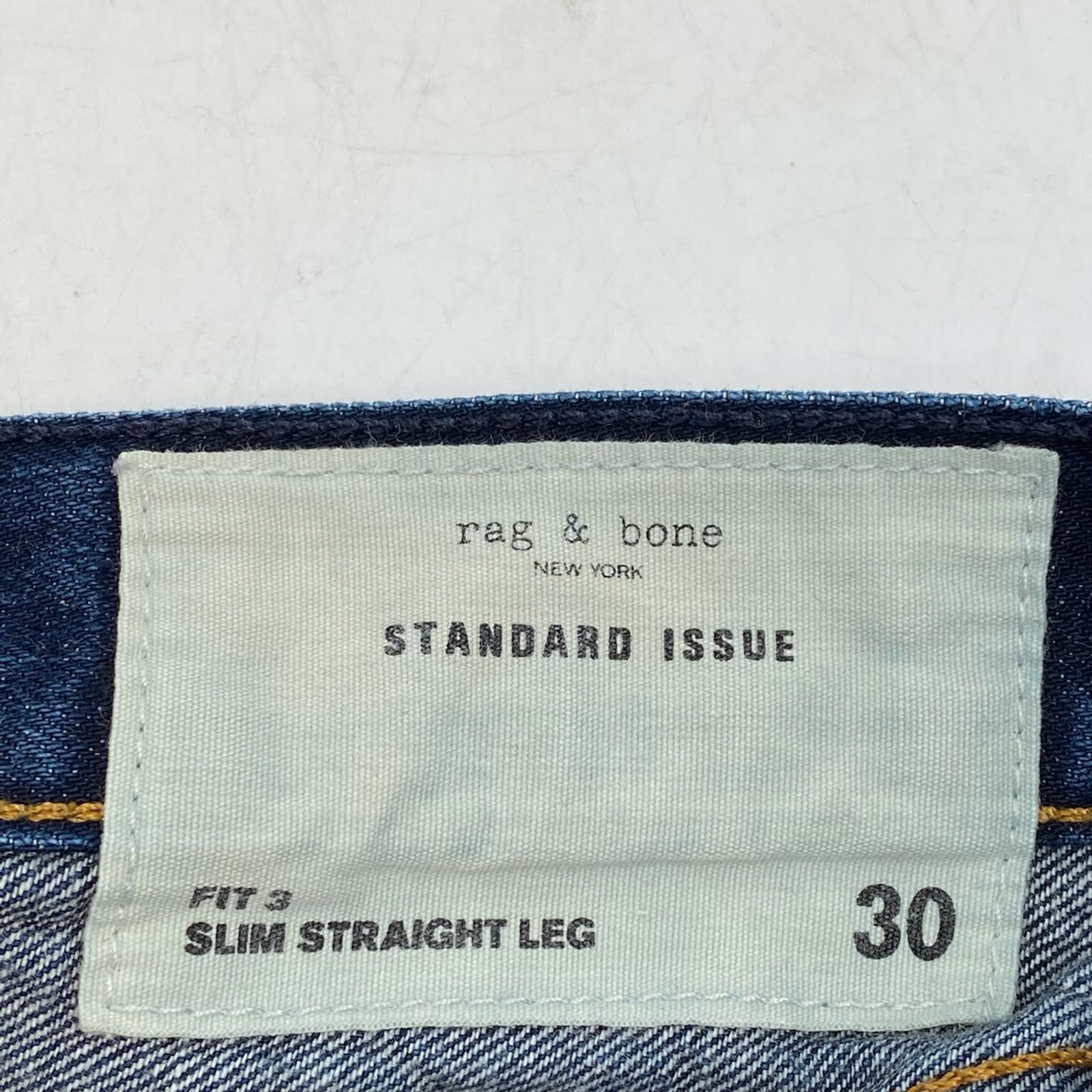 This denim slim straight jean from rag & bone offers everyday versatility with a clean, classic silhouette. Made in the United States from cotton denim, it sits slim through the thigh and straight at the leg for a timeless, put-together look. Durable, comfortable, and easy to pair with your favorite knit tops or tees for a polished, all-season outfit. Features: - Cotton denim for a soft, breathable feel - Slim through the thigh with a straight leg - Made in the United States for quality and fit - Solid blue wash with classic five-pocket styling - Regular size 30 for dependable everyday wear - Approx. Measurements: Inseam Measurement: 31in, Waist Measurement: 15in, Rise Measurement: 10in - Inventory: 1140194 This is the pair your everyday outfits have been asking for.