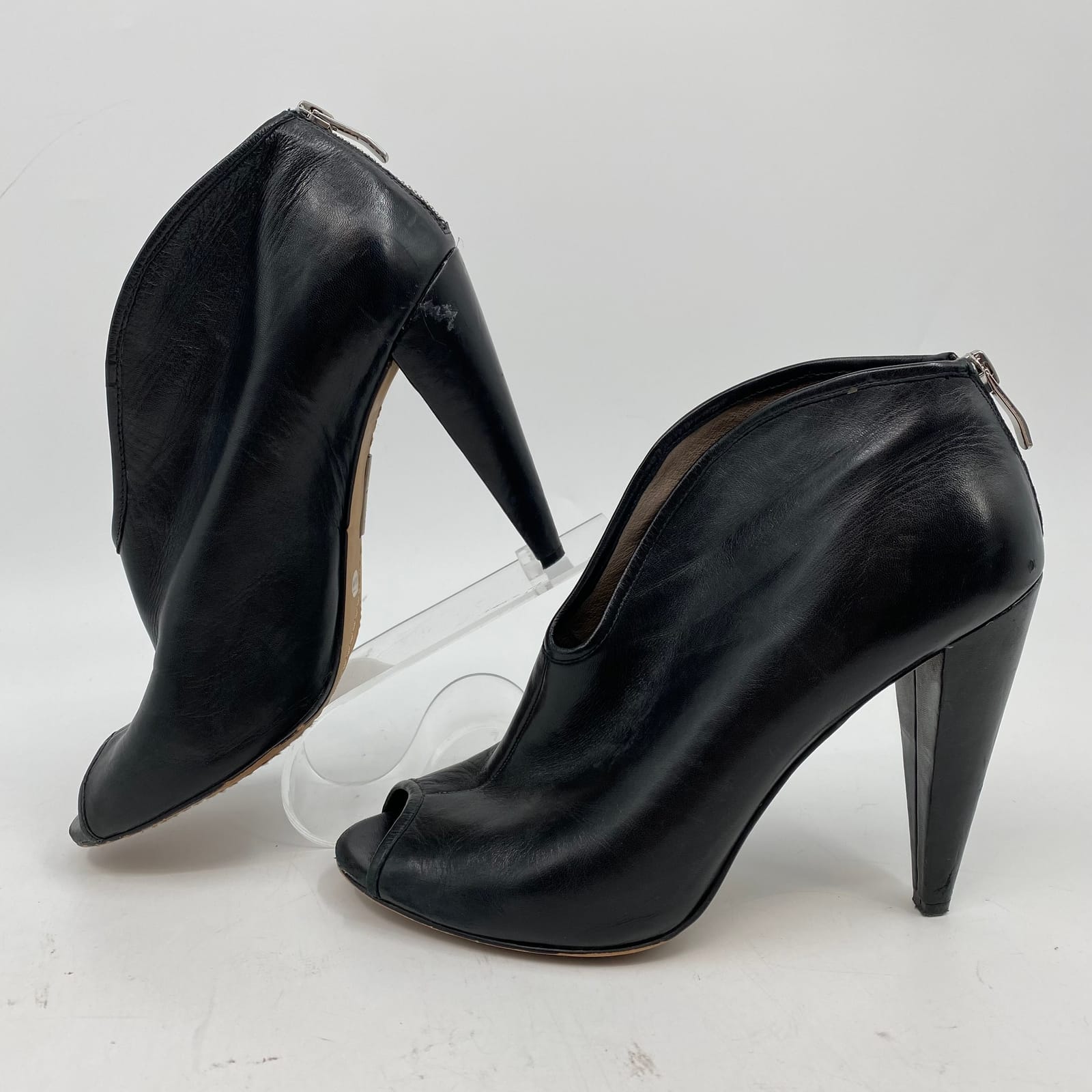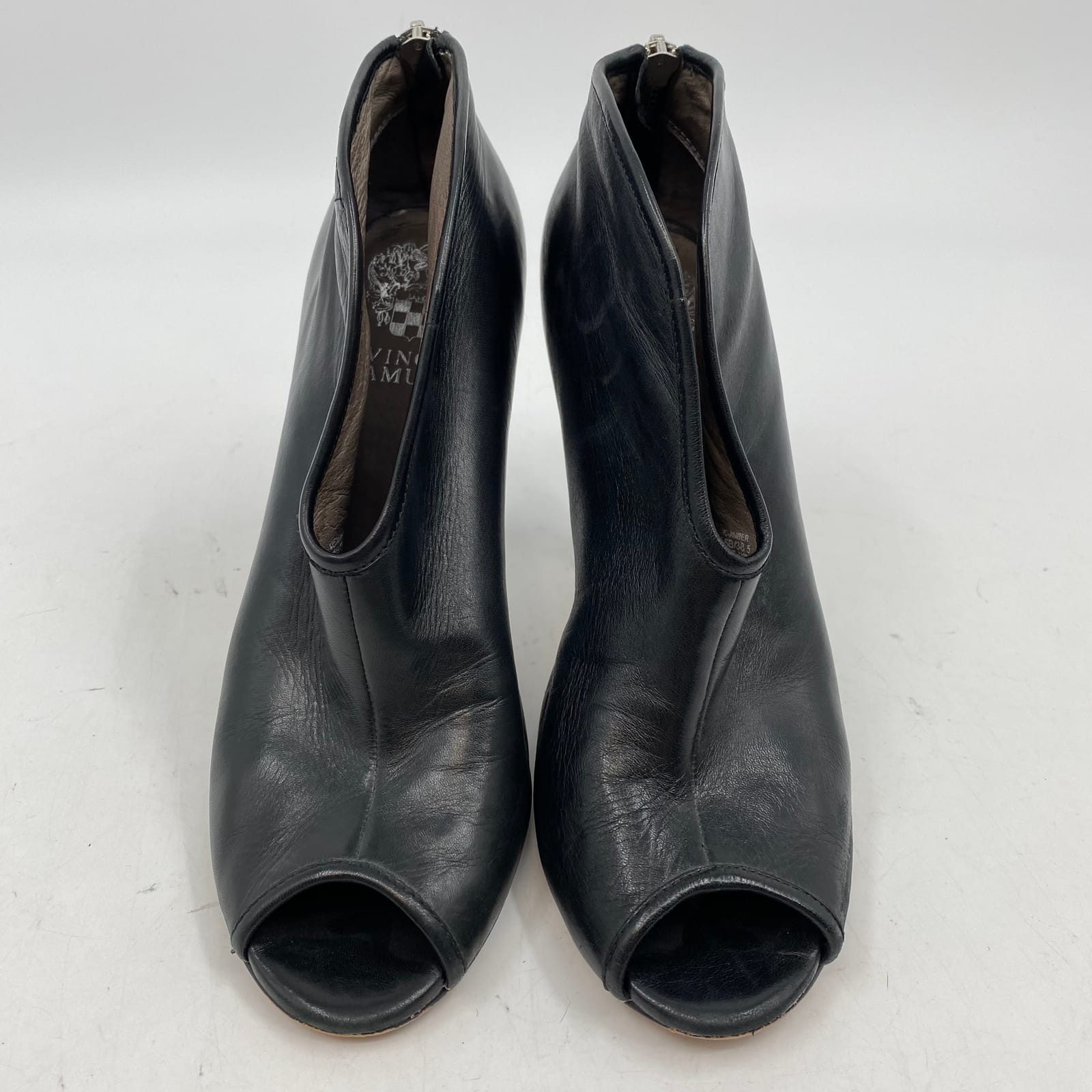 Elevate your style with these Vince Camuto black leather peep toe heels, perfect for any occasion. Crafted from premium leather, these ultra-high heels offer a chic silhouette while providing the comfort you need for all-day wear. Pair them with your favorite dress or tailored pants to create a stunning look that captures attention. Features: - Premium leather construction for durability and style - Ultra-high cone heel for added height - Peep toe design adds a touch of elegance - Convenient zip closure for easy on and off - Versatile enough for year-round wear - Flaws: Scrapes on backs of heels, as pictured. - Inventory: 1123738 A limited find that won’t hang around long.