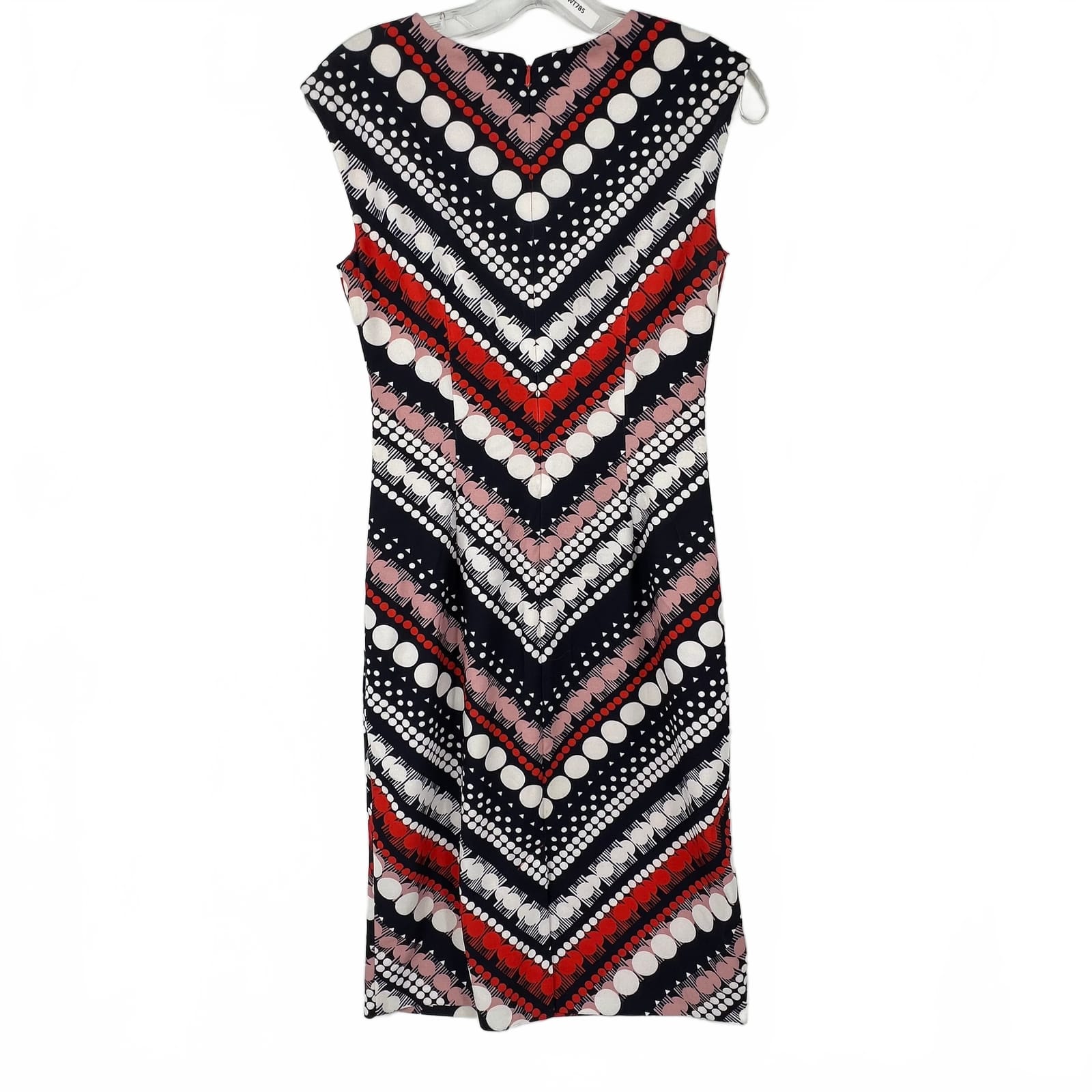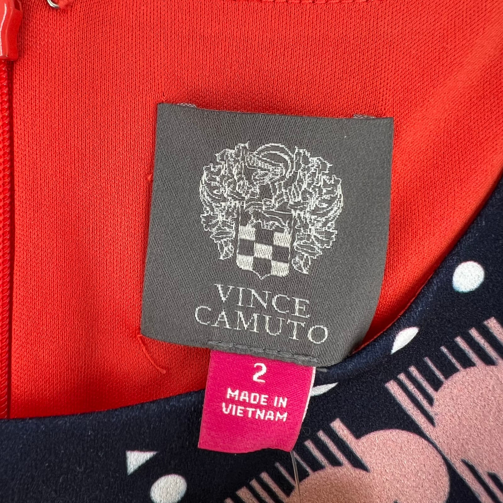 This Vince Camuto midi dress brings classic geometry to your formal closet. The navy, white, and red print pops with clean lines, while a flattering fit and flare silhouette flatters your figure. Made in Vietnam from a polyester-spandex blend, it offers a smooth drape and comfortable stretch for standing receptions or occasions that call for polished style. Note: some visible stains on the front in photos; consider professional cleaning to restore its pristine look. Features: - Polyester-spandex blend for a smooth drape and slight stretch - Midi length with fit & flare silhouette for flattering movement - Geometric navy/white/red print adds formal polish - Made in Vietnam for reliable construction - Ideal for spring and summer formal events - Approx. Measurements: Pit To Pit: 16, Length: 39 - Flaws: Stains on front of dress, as seen in pictures - Inventory: 1049317 This dress is a standout for your next event—act now before it’s gone.